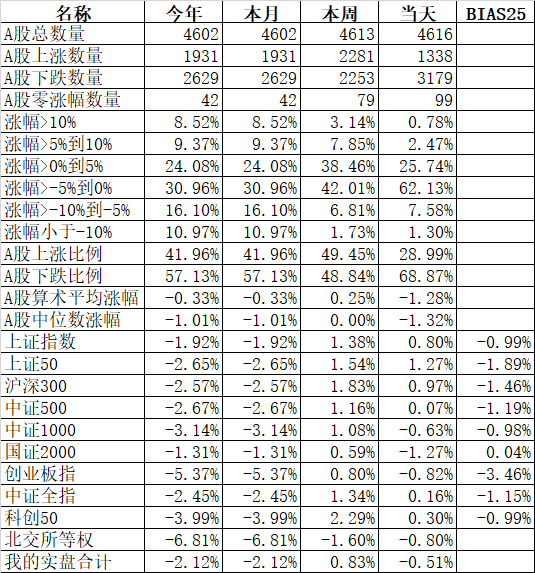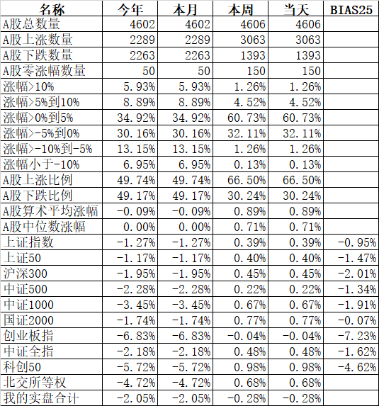 市场普遍还是弱,板块上只有医药、银行、钢铁、电力、房地产等少数低估板块上涨,军工、互联网、农林牧渔、半导体等大部分板块都是下跌的。北上资金也是一路卖出,最终净卖出了40.26亿。宽基指数中最强的上证50和国证2000分别下跌了0.67%和0.75%,昨天最强的科创50指数今天成了最弱的宽基指数,下跌了1.81%。