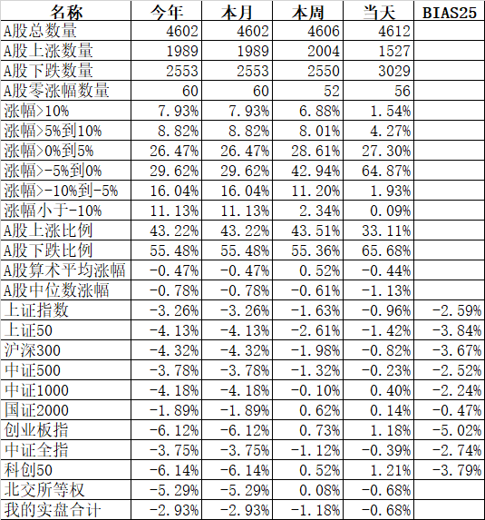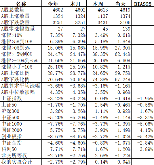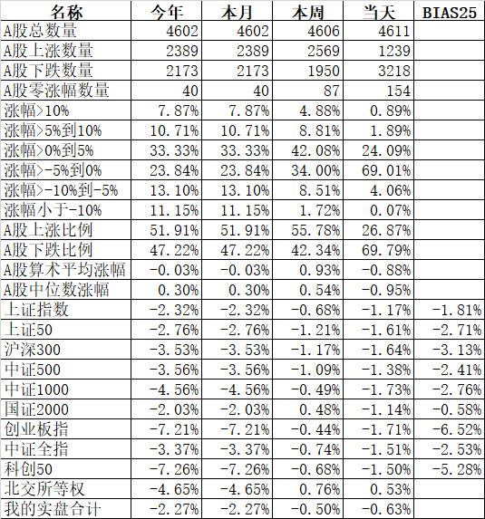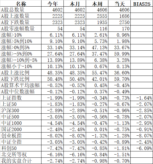 今天除了医药股下跌的多,还有军工、农林牧渔、石油等大部分板块都是下跌的,只有旅游、煤炭、酿酒、公共交通、有色、食品饮料等少数板块上涨。绝大部分宽基指数下跌都在1%左右,跌的最少的上证50下跌了0.46%,跌的最多的国证2000下跌1.49%,前期小票好几天跑赢大票,本周变成大票连续好几天跑赢小票。