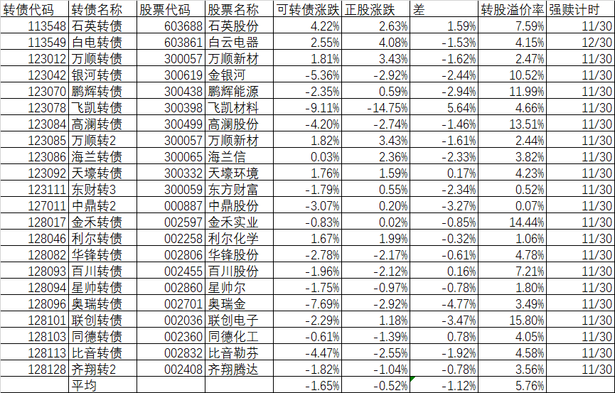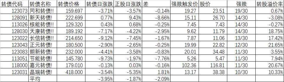今天可转债等权指数下跌0.72%,对应的正股平均下跌了0.53%,但如果看即将满足强赎条件的可转债,下跌就惨多了,最近30个交易日里已经有10个交易日满足强赎条件的一共有10只可转债,正股平均下跌1.87%,但对应的可转债平均下跌了3.95%,除了还有5个交易日才能满足强赎的晶锐转债,可转债跌幅比正股跌幅小一点,其他9只可转债的表现均远远不如正股,特别是新天转债,正股涨了9.43%,可转债才涨了0.77%,结果弄出了转股溢价率竟然是负的3.08%。而节能转债,正股才跌了1.97%,可转债却大跌9.73%,即使这样,还有7.94%的溢价率,在未来4个交易日是否会消化掉。风险最大的天康转债,明天即使正股跌停都能满足强赎条件了,而目前还有18.75%的溢价率,好比是高悬在头上的一把达摩克利斯之剑。其他如长信转债、正元转债、嘉元转债,分别溢价了17.42%、21.65%、20.67%,还有2到4个交易日大概率满足强赎条件,市场会因为对未来强赎的恐惧而在未来几天杀溢价。