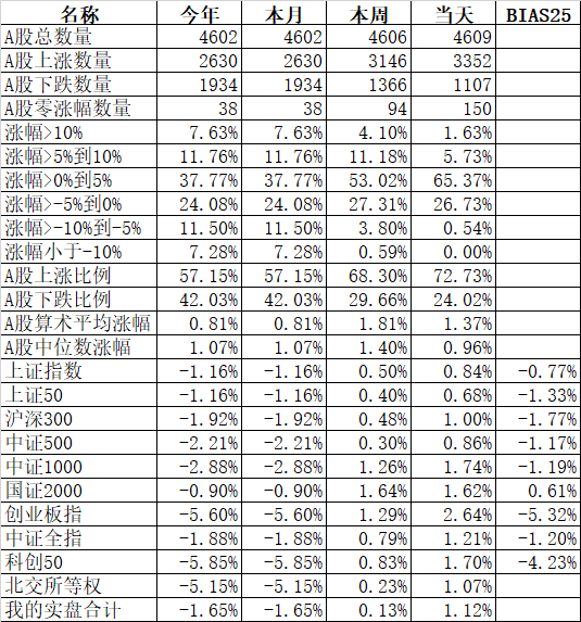 今天国证2000也大涨了1.62%,全市场可转债平均上涨0.95%,对应的正股平均上涨了1.37%。其中可转债价格在110元以下的平均下跌了0.02%,110-120元平均上涨了0.16%、120-130元平均上涨了0.25%,而130元以上的平均上涨了1.65%。高价债前期下跌厉害,今天上涨得到了补偿,我的实盘也回血了1.12%。