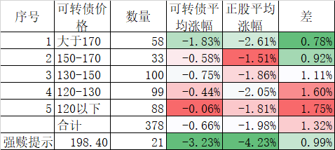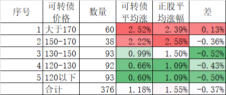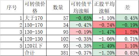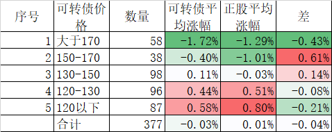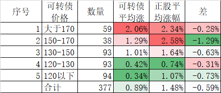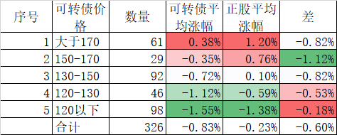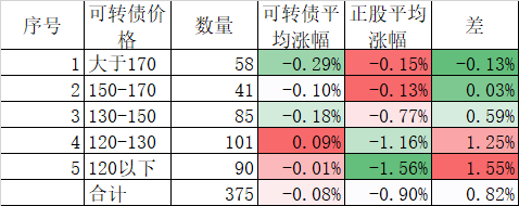如果看可转债的不同价格的表现,就更加清楚了。上涨的时候一般都是高价债涨的好。价格大于170元的60只可转债,正股平均上涨2.39%,可转债平均上涨2.52%,而93只120元以下的可转债,才涨了0.60%,而正股平均上涨了1.09%。