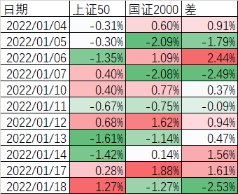 去年小盘明显跑赢大盘,今年刚刚开始了半个多月,大小盘跷跷板行情特别明显,以上证50和国证2000每天涨幅对比来看,从1月4日到1月12日连续7个交易日,一天开小一天开大,跷跷板效应特别明显。直到1月13日后,连续4个交易日2000战胜50,而且平均跑赢了不少。直到今天,被2000压制了4天的50终于来了一次大幅度跑赢2000了。