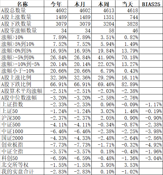 看个股就更惨了,上涨的个股只有744只,下跌的个股却有3828只,下跌的比例高达82.89%,个股跌幅中位数高达2.76%。