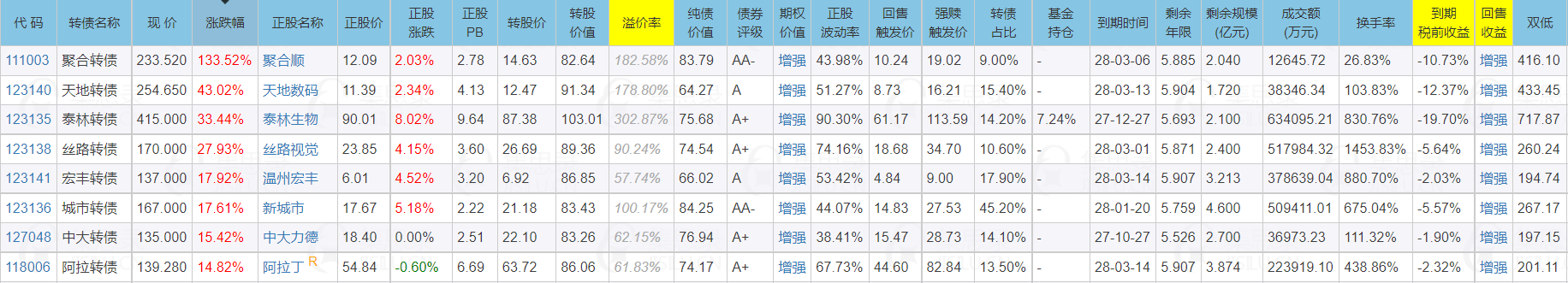 成交额高不一定柚子来了,但仔细看一下今天涨幅前8名的可转债,今天涨幅133.52%的聚合转债是今天新上市的新债,大涨133.52%后溢价率高达182.58%,成为典型的双高债。其他7个债的正股无一涨停,但涨幅最低的阿拉转债也涨了14.82%,搞笑的是正股竟然跌了0.60%。这些可转债中溢价率最低的宏丰转债也有57.74%,而可转债的价格已经到了137元。