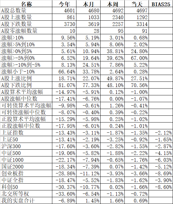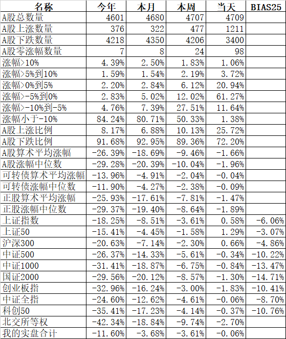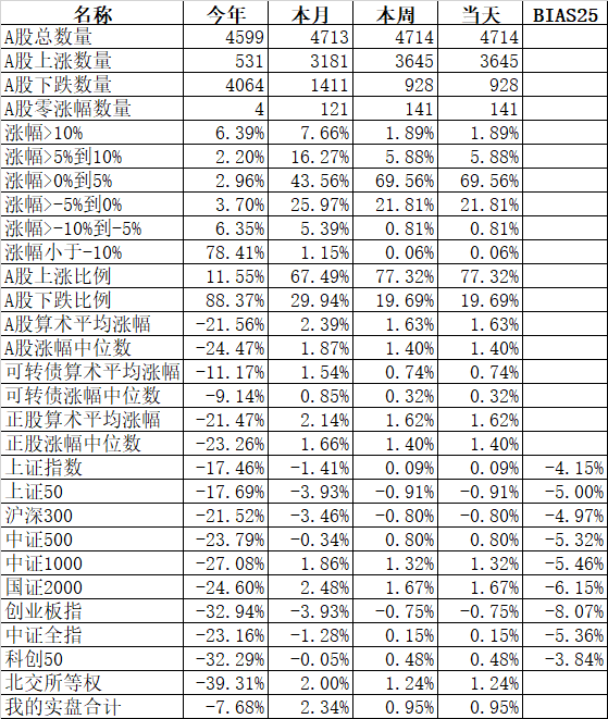 有网友问我既然你对未来偏空,为什么不减仓。说实在我不知道什么时候涨,特别遇到大涨,你是判断为熊市里的反弹,还是反转,我实在是没这个本事判断。2019到2021年这三年,事后看基本上算牛市吧,但其中经历了很多如贸易战、突如其来的疫情等等大利空。如果当时我空仓了,后来的上涨十有八九不在场,或者说仓位不高导致收益下降,这3年之所以能取得200%多的收益率,就是靠着满仓。事后看的一清二楚的事情,在事前很难看得清楚,所有我还是选择了满仓,但满仓可转债比满仓股票和基金要少跌很多,也就是说我无法改变贝塔收益,但尽可能去改变阿尔法收益。这个月大部分指数跌幅都超过10%,我的账户基本没跌,已经足够了。
