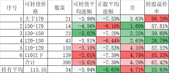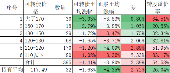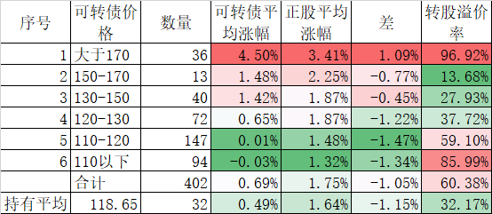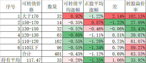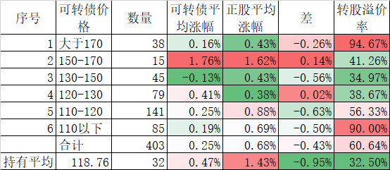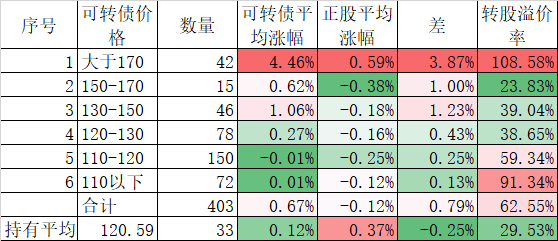 今天可转债对应的正股平均下跌了0.12%,但可转债平均上涨了0.67%,主要是130元以上的可转债涨的多,特别是170元以上的可转债,正股平均只上涨了0.59%,但可转债平均上涨了4.46%。今天价格大于170元而且涨幅超过10%的有溢利、铂科、聚合、山石、阿拉、宏丰、丝路、胜蓝8只,除了铂科的溢价率81.92%没有到100%,其他7只全部超过100%,而且今天他们对应的正股,涨的最多的溢利正股也就只有涨了5.10%,而可转债则大涨了27.46%。