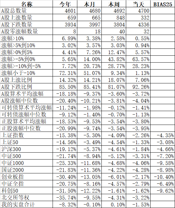 56个行业板块只有保险和银行微红,其他54个行业悉数下跌。以旅游、酒店餐饮等领跌。个股中今天有宁德时代、隆基股份、中芯国际、上汽集团、三峡能源、京东方A、国电南端、赣锋锂业、中国中车、韦尔股份、海通证券、亿纬锂能、北方稀土、航发动力、阳光电源、包钢股份、科大讯飞、华友钴业等1581只股票盘中创出今年新低,占了4700只A股的1/3强。个股的中位数跌幅高达4.04%,92.26%的股票下跌,不仅三分之一的股票创了今年新低,而且接近三分之一的股票跌幅超过5%。和2018年年底大熊市的底部相比,3519只股票中有1121只股票复权价格已经低于2018年年底的价格了。其中中国石油跌去20%、中国平安跌去10%,浦发银行、万科、中国太保、中国人保、工业富联、上汽集团、民生银行、中国中铁、中国中车、中国交建、华泰证券等1121只股票低于2018年年末大熊市的价格了。