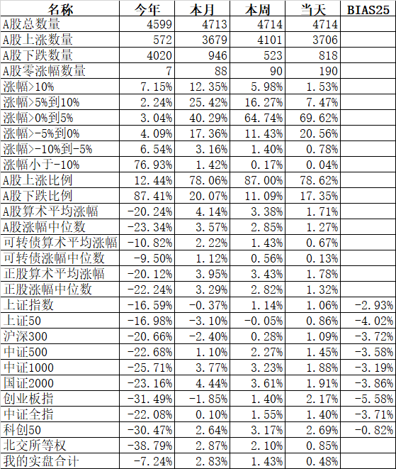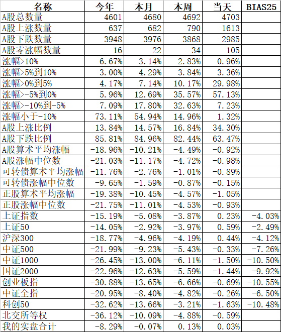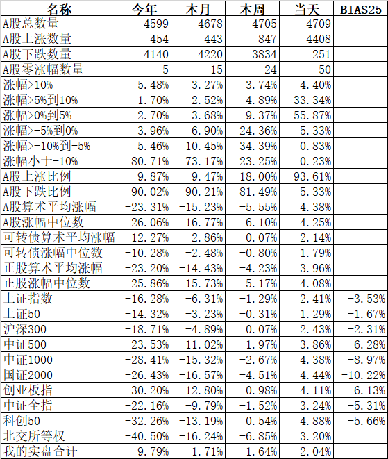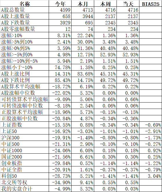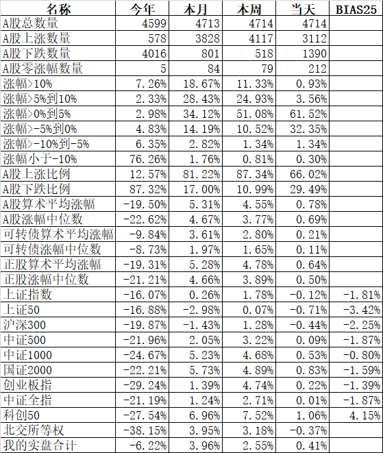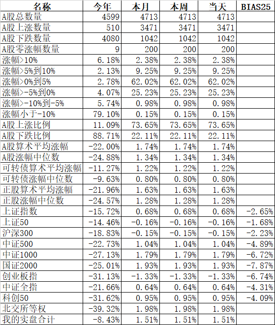 行业板块上农林牧渔、煤炭、房地产等领涨,大部分确实和十大利好有关。但医药、食品等板块领跌。个股涨跌各半,涨幅中位数正好为零。今天个股比大部分指数强一点。