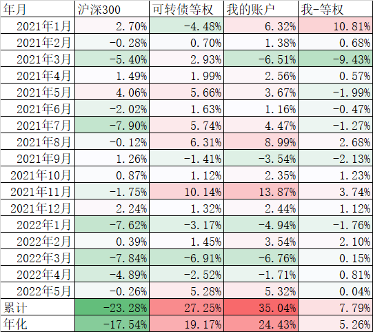 一般我们把沪深300指数作为基准收益,即贝塔收益,超越部分为阿尔法收益。这样从2021年开始年化超越=19.17%+17.54%=36.71%。但其实去年开始我大部分时间都几乎满仓了可转债,所以基准用沪深300指数,还不如用集思录上的可转债等权指数,如果这样衡量,那么年化的阿尔法收益也只有5.26%,其实并不高。