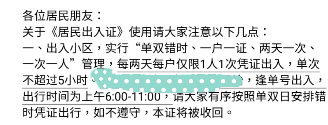 好消息,今天晚上我们小区要发出入证了,还是四个有限:“时间有限,人数有限,距离有限,店面有限。”