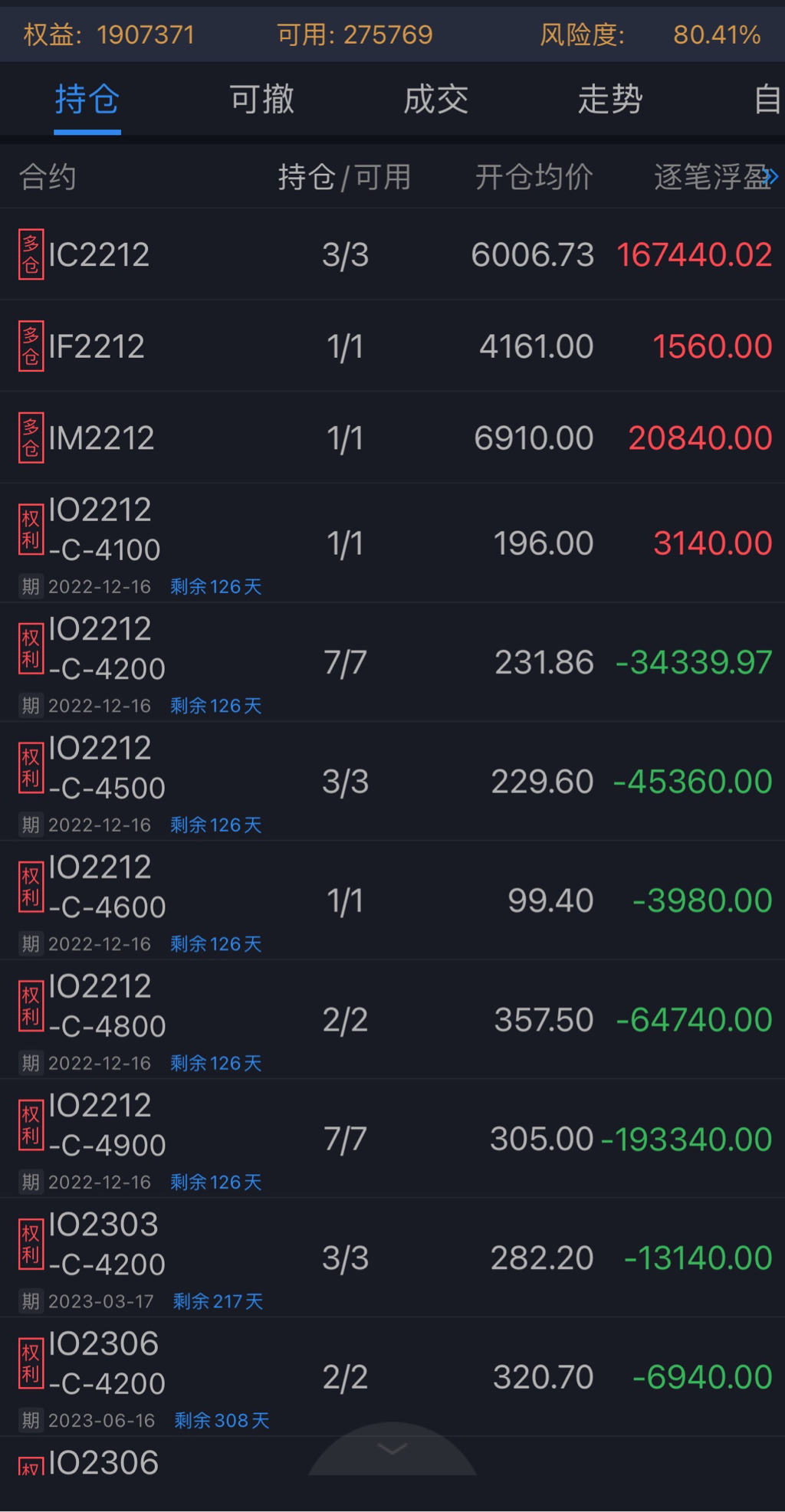 这段时间进行了一点小改动,增持了if,ic,im 各一张,mo增持两张,同时卖掉了12张io,相当于仓位没有变,调整了一下结构。所以现在是31张io+mo ,还有5张期权。