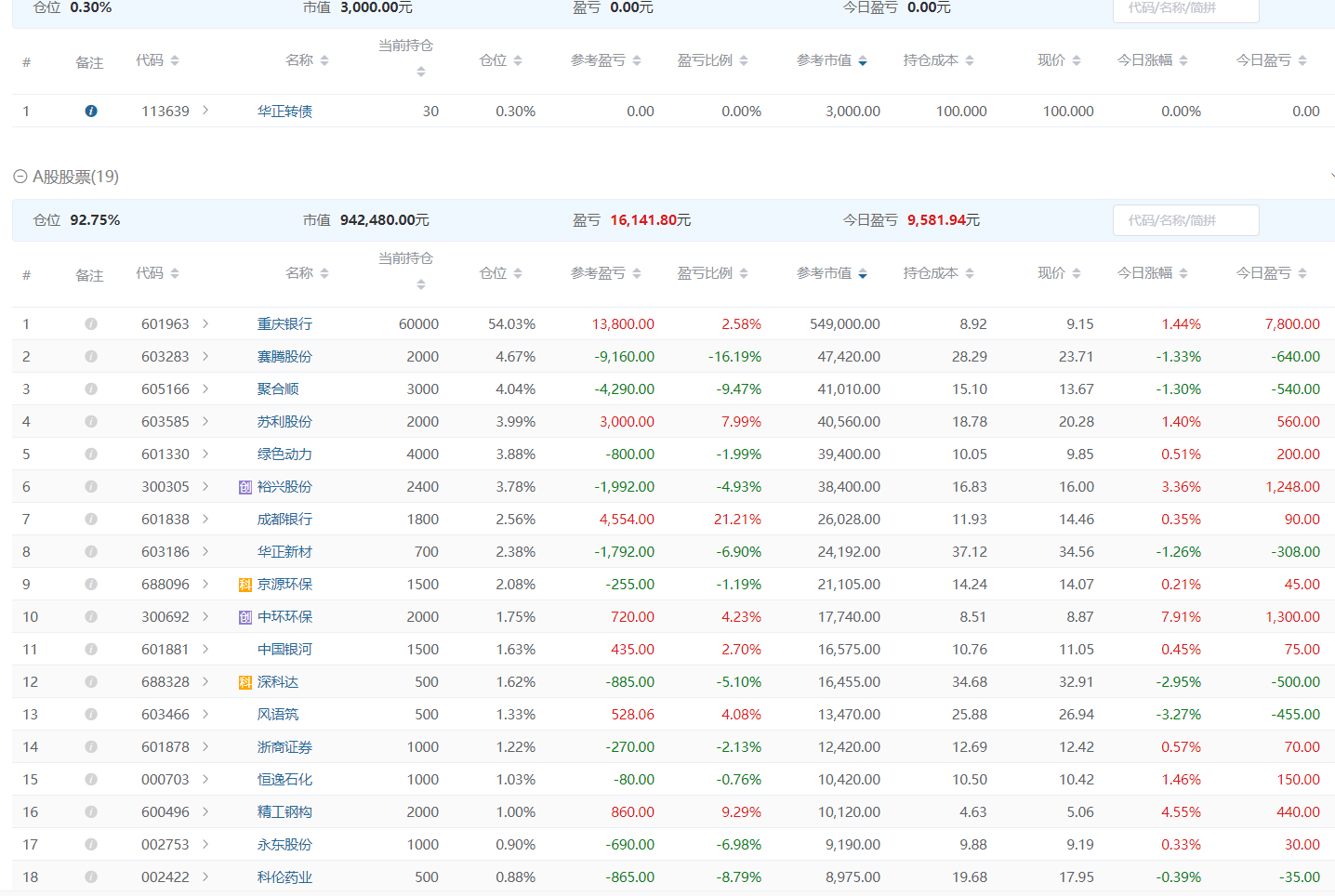 加仓重庆银行、聚合顺、绿色动力、中环环保、京源环保和裕兴股份。
