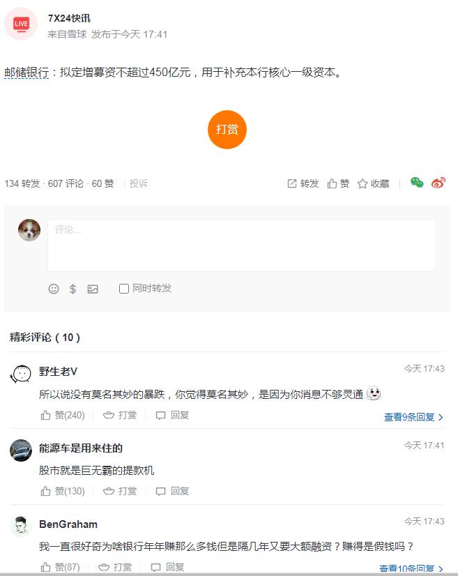 现在的舆情真是好奇葩啊,以我的3观真是不容易理解。人家大股东或者机构,愿意市场价接近翻倍的价格给邮储输血,路人们至于这么大的戾气吗?