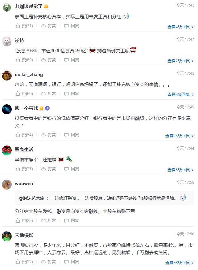 我勒个去,有要脸的大股东,就有不要脸的。今天又来一家融资的全国性银行。A股0.4PB,H股0.2PB,还配股。。。 你就明说已经技术性破产,不配股就要掀开马桶盖了就是。劝各位朋友一句,如果投资银行股,不管是长持还是短投,不管是收息还是短期投机,一定要有个黑名单白名单,不然碰到垃圾,随时有可能被坑杀。不过作为路人,笑看拉低整体估值,然后息率又可以再提高一点了。