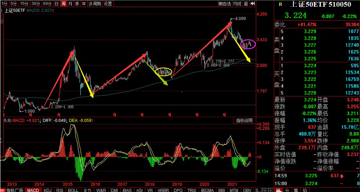 还要根据前后(前几年涨幅,后面的波动规律),左右(旁边的其他指数上证50.沪深300.大盘)综合考虑。