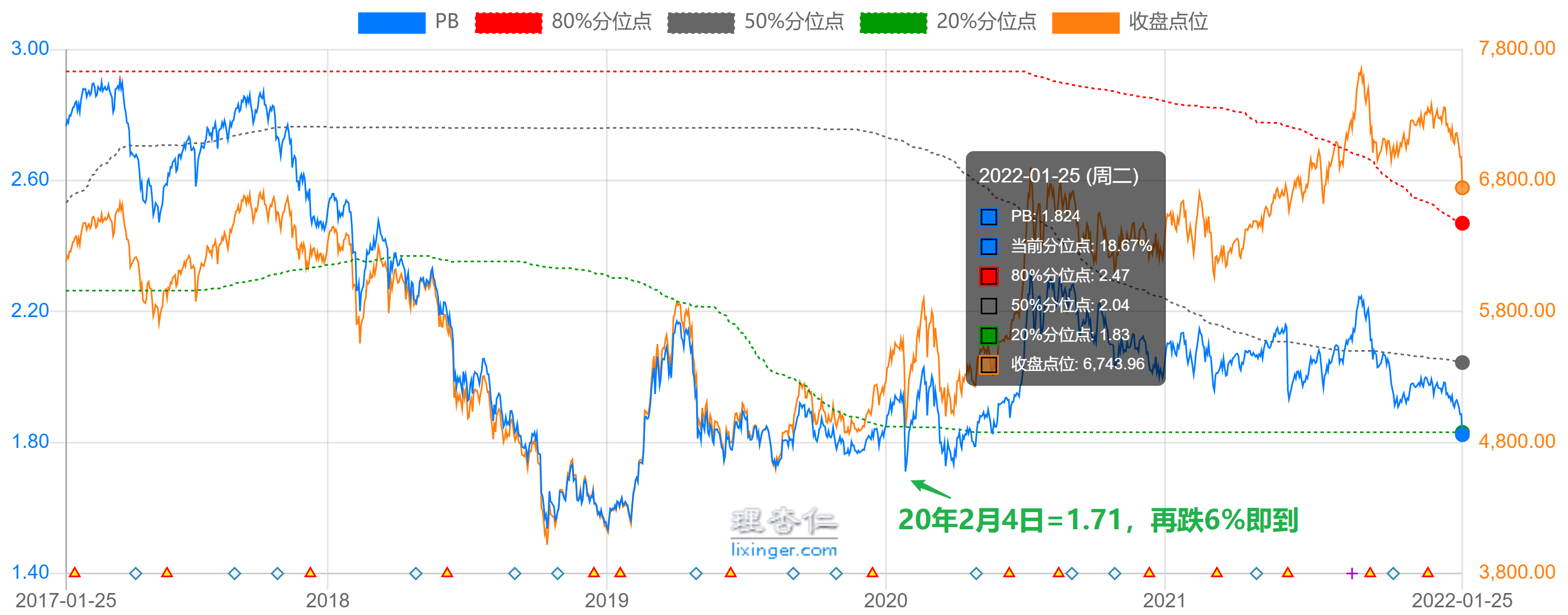 3. 20年疫情恐慌低点PB是1.72,当前1.82,再跌6%就到了这个水平,在货币宽松期,没搞去杠杆,跌破疫情恐慌低点的概率有多大,大家可以心里评估一下。