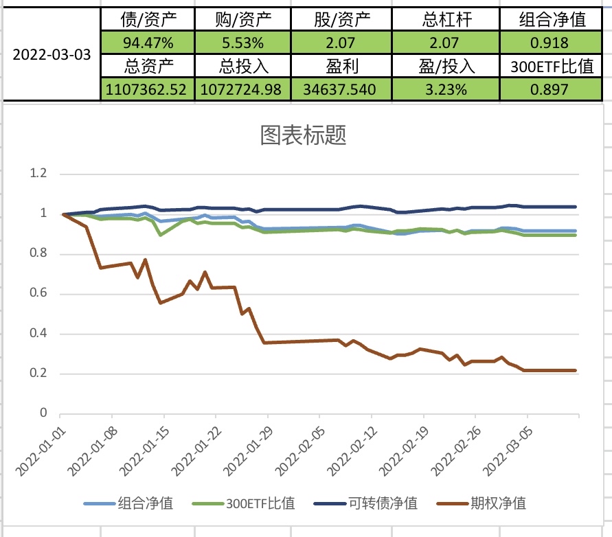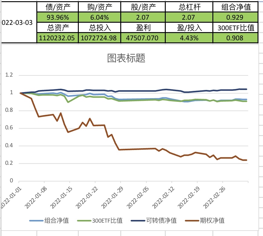 持续关注,正好和我自己的实盘做个比对,我采用80%固收+,20%对角价差,1.1-1.28收益率-2.25%,固收+和卖购都体现出良好的防守性能。