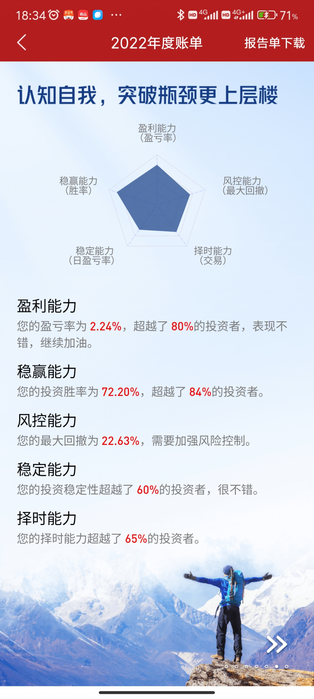 颠簸一年,心态较稳,最终小赚2.18%,和存银行差不多,但增长了见识,还是满意的。