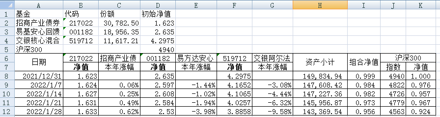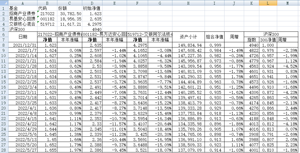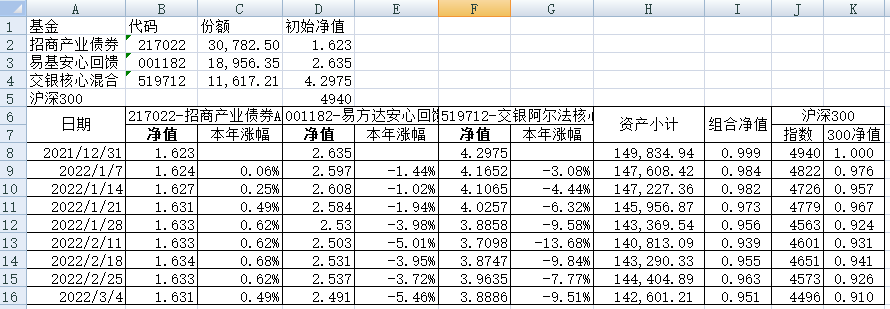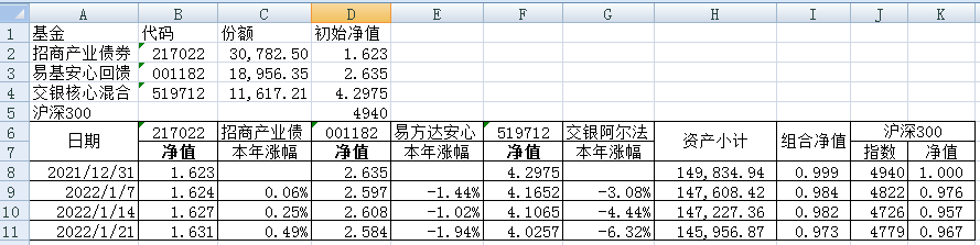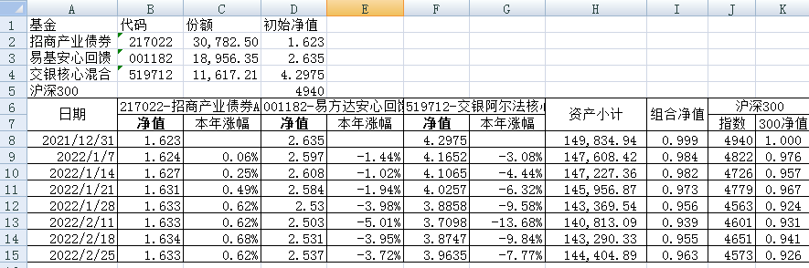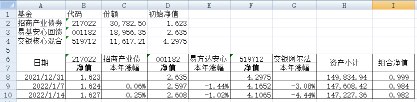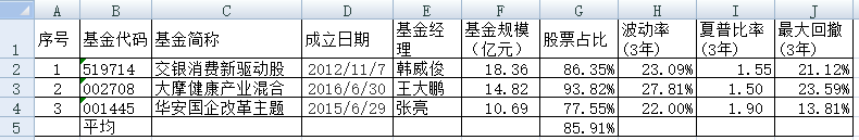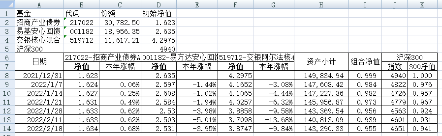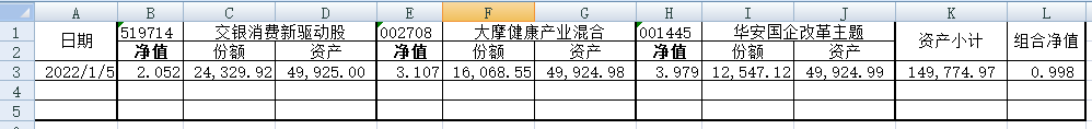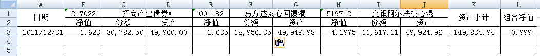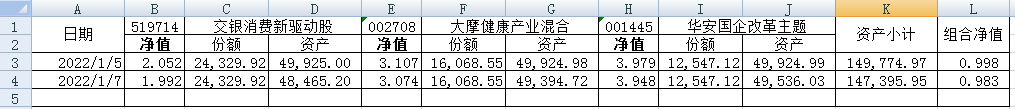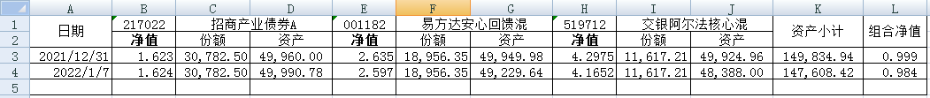 同组合1一样,组合2的每只基金购买5万元。组合2的份额及净值见下表。