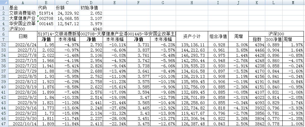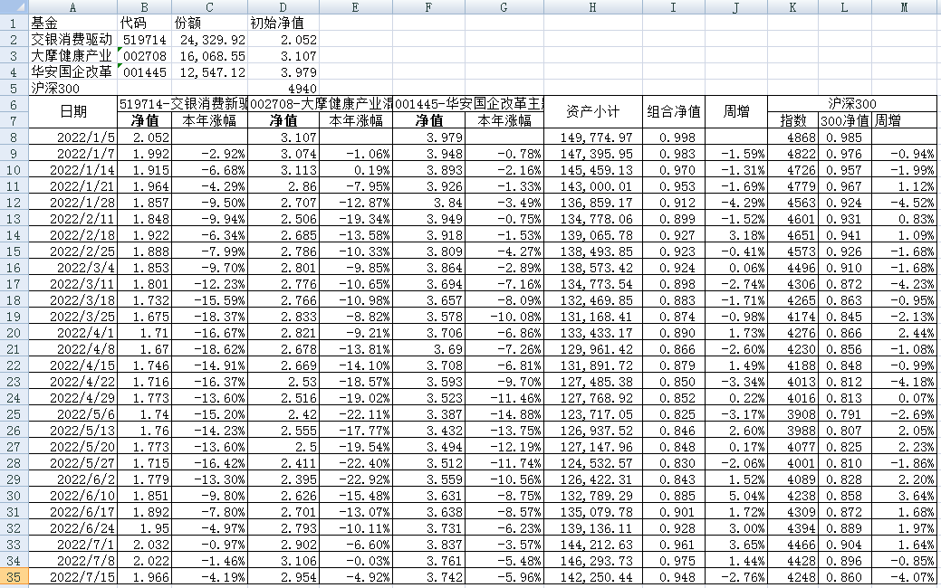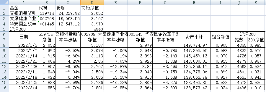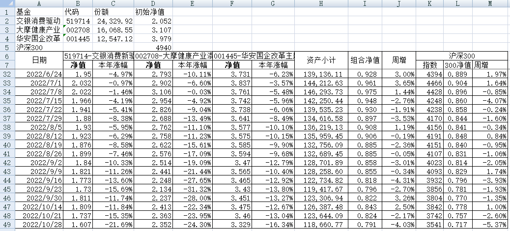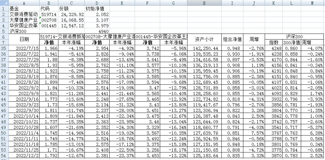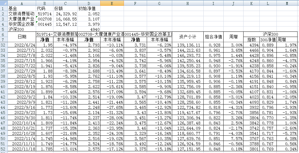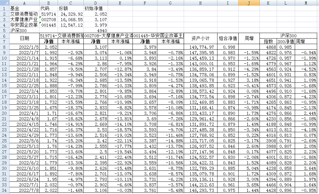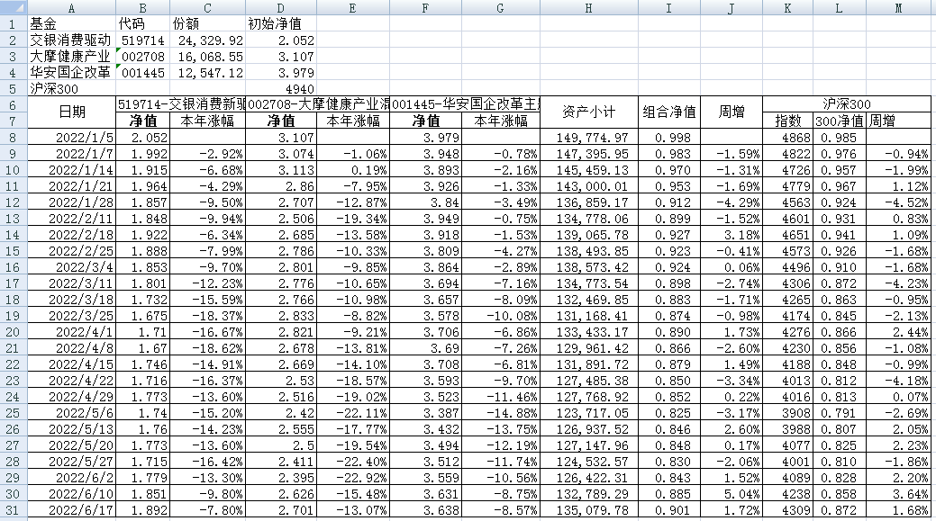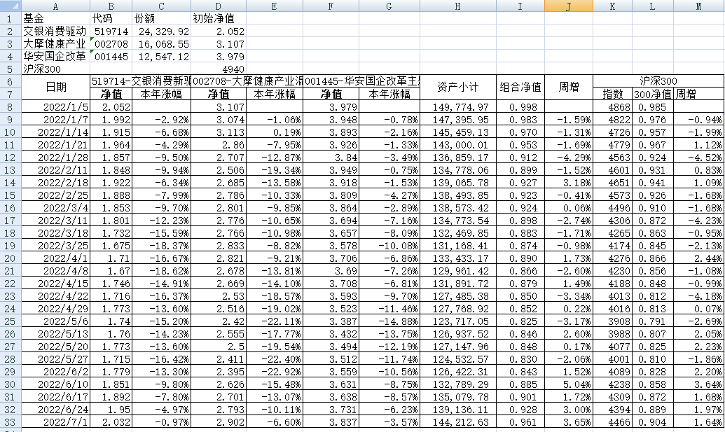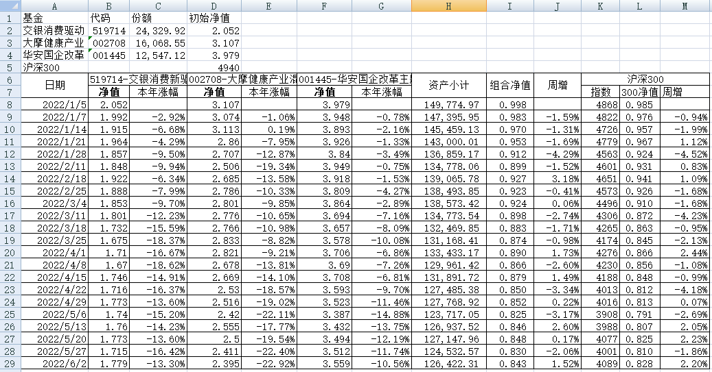 最近看了集友“账户已注销”的文章《正所谓乱拳打死老师傅》。他认为消费、医疗健康、科技、高端制造四个行业是好赛道,受其启发,本周建立了组合2。由交银消费新驱动、大摩健康产业混合、华安国企改革主题3只基金组成,前面2只基金是消费、医疗健康赛道,第3只基金有一些变化,我个人认为国企改革在2022年应该也是一个比较好的赛道。