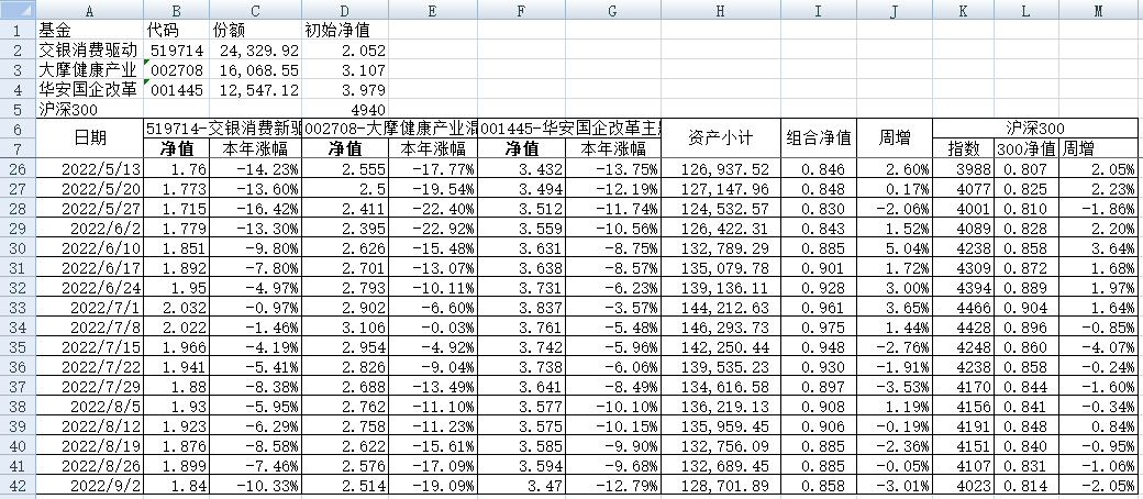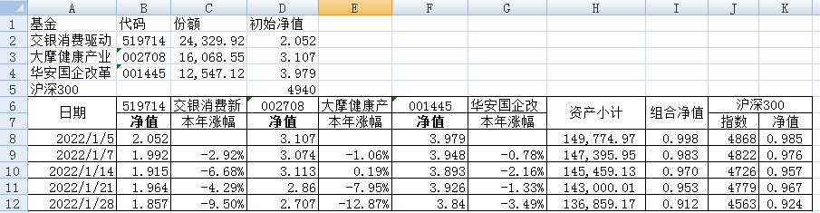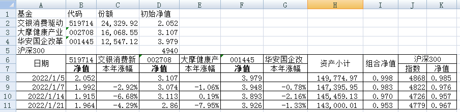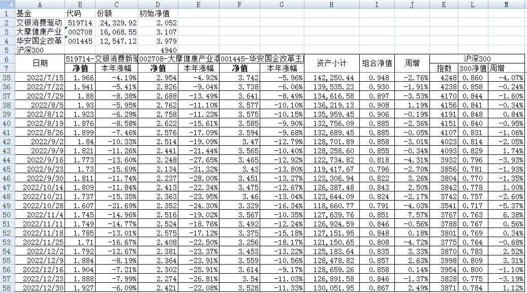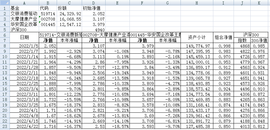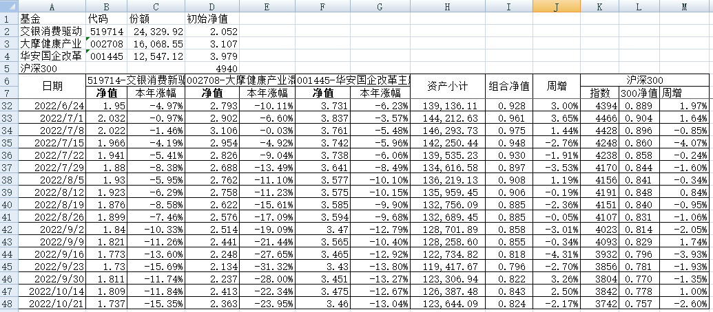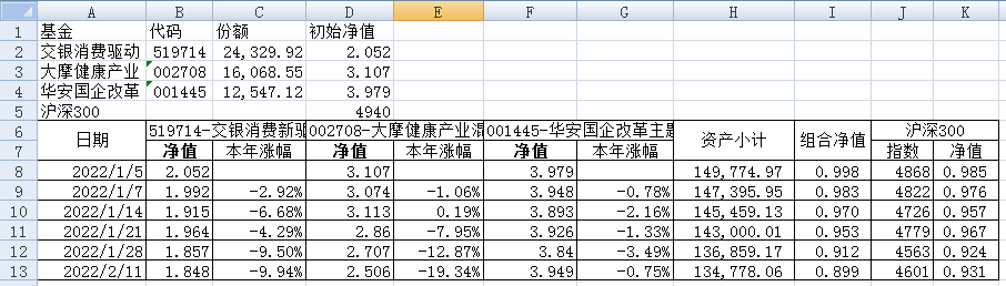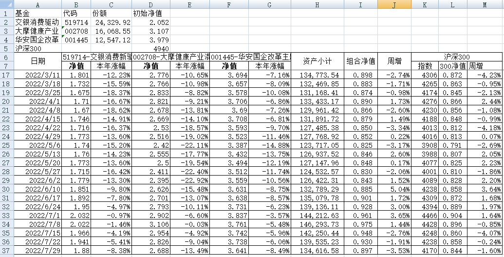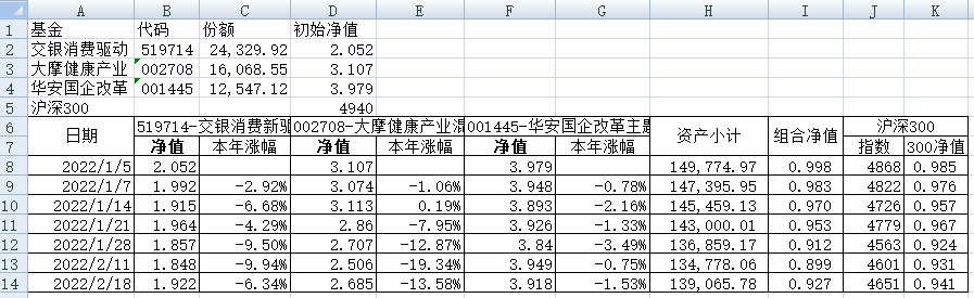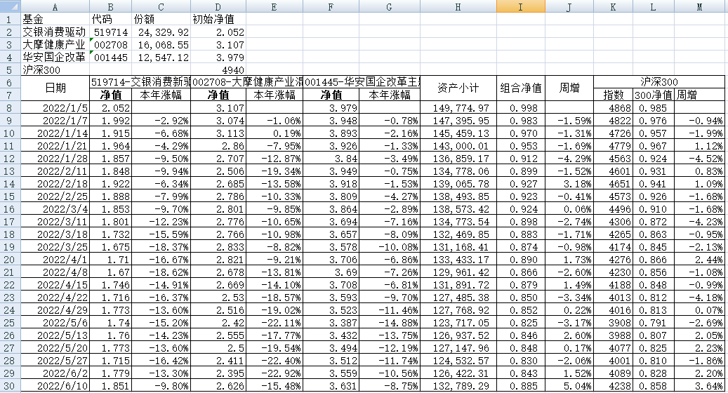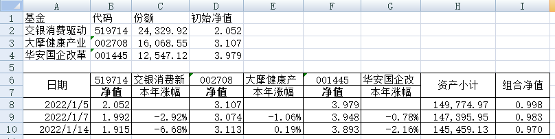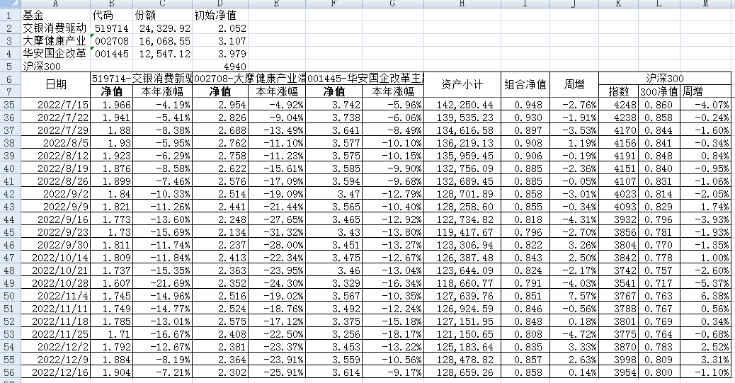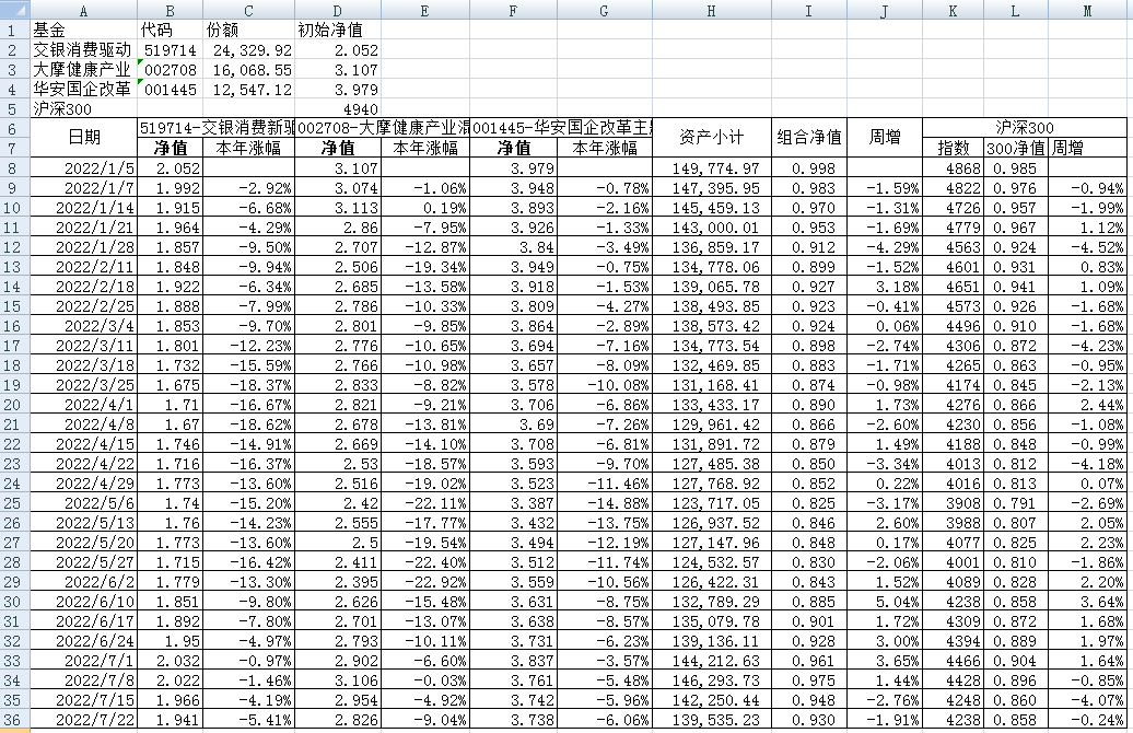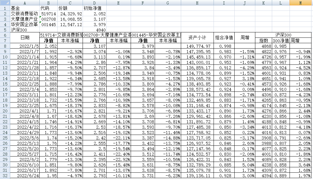 最近看了集友“账户已注销”的文章《正所谓乱拳打死老师傅》。他认为消费、医疗健康、科技、高端制造四个行业是好赛道,受其启发,本周建立了组合2。由交银消费新驱动、大摩健康产业混合、华安国企改革主题3只基金组成,前面2只基金是消费、医疗健康赛道,第3只基金有一些变化,我个人认为国企改革在2022年应该也是一个比较好的赛道。