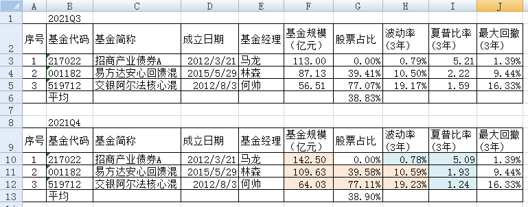 易方达安心回馈的规模下降了,股票占比和夏普比率下降了。股票占比下降不好理解,大盘下跌应该加仓更多股票,不知道基金经理是怎么想的。