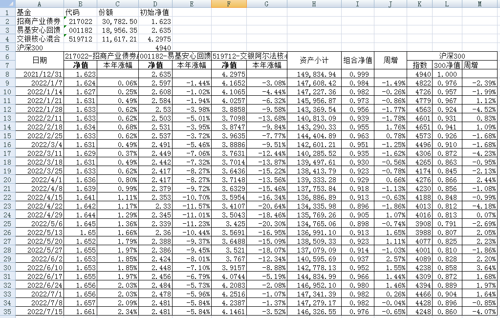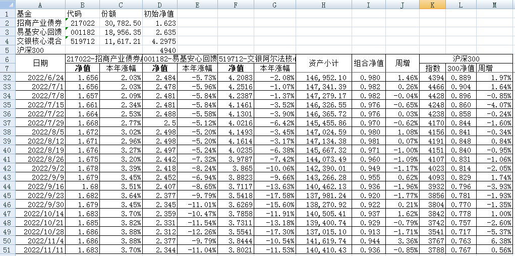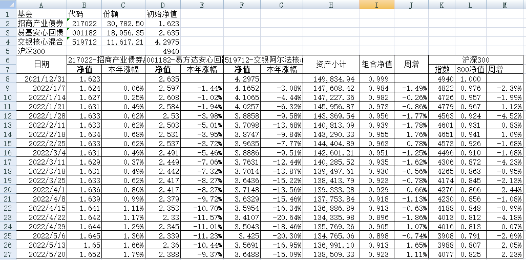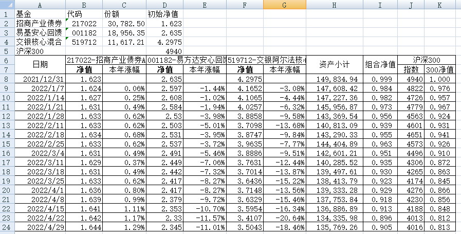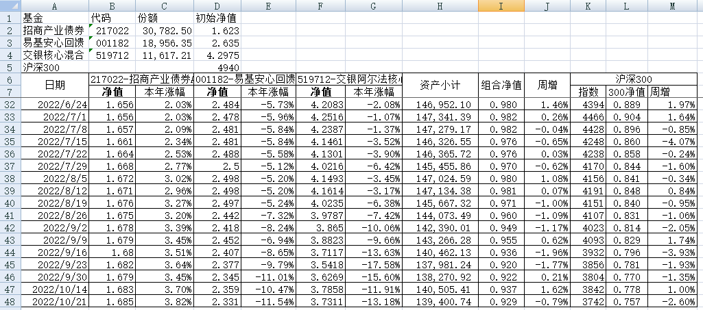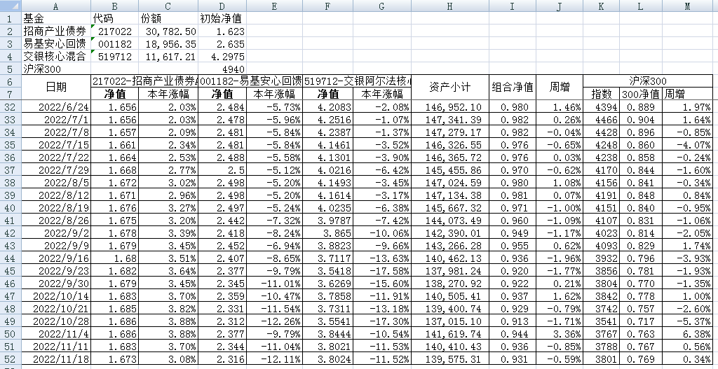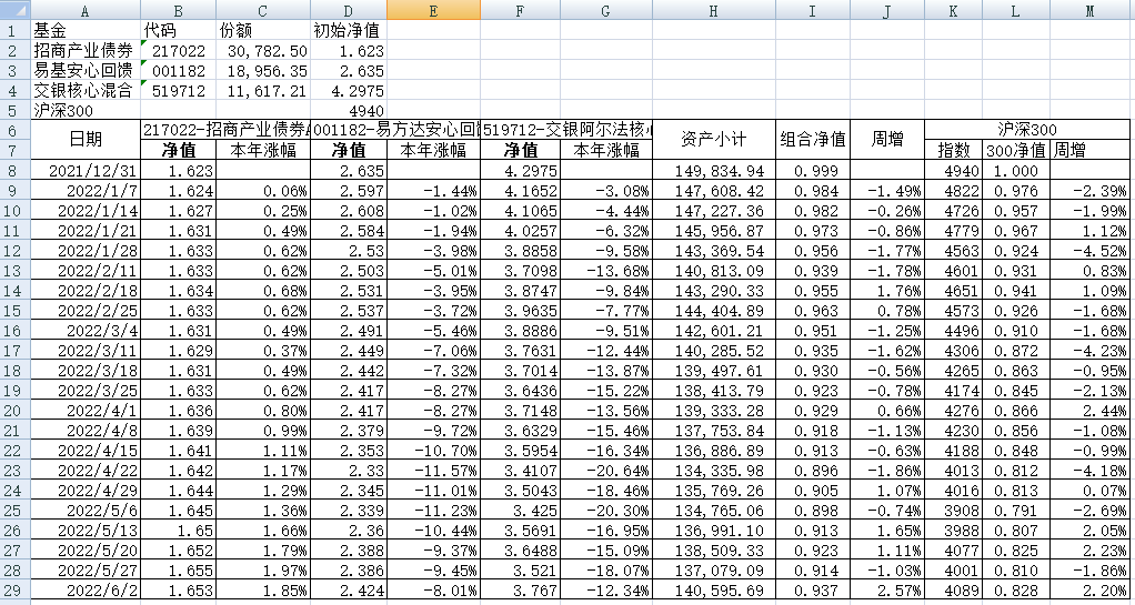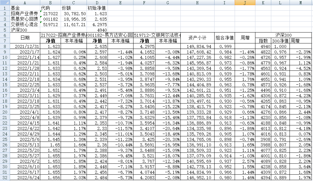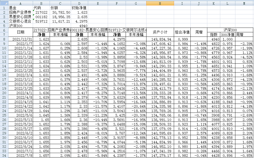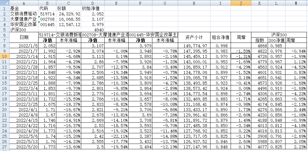 我的稳健组合-7%,赛道组合-13%。虽然跑赢两个指数,但收益是负的。仅有招商产业债券A一只基金保持正收益(2.59%),跌幅最大的是大摩健康产业混合基金(-22%)。