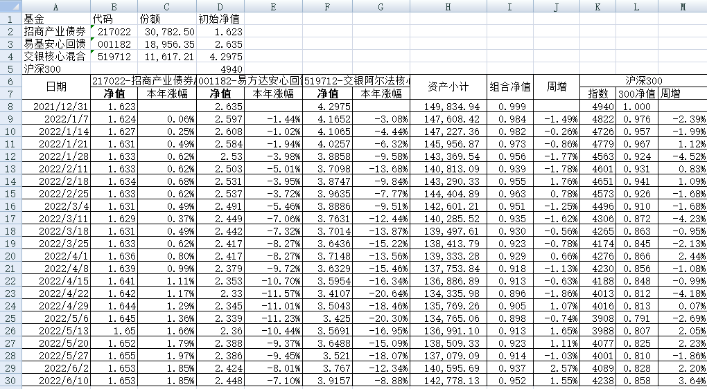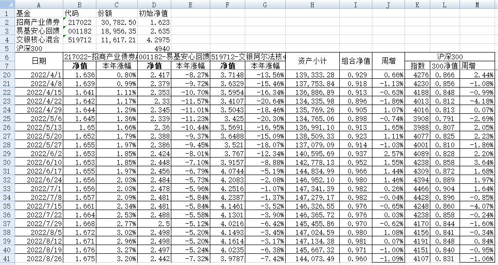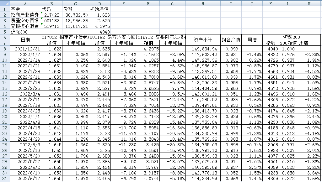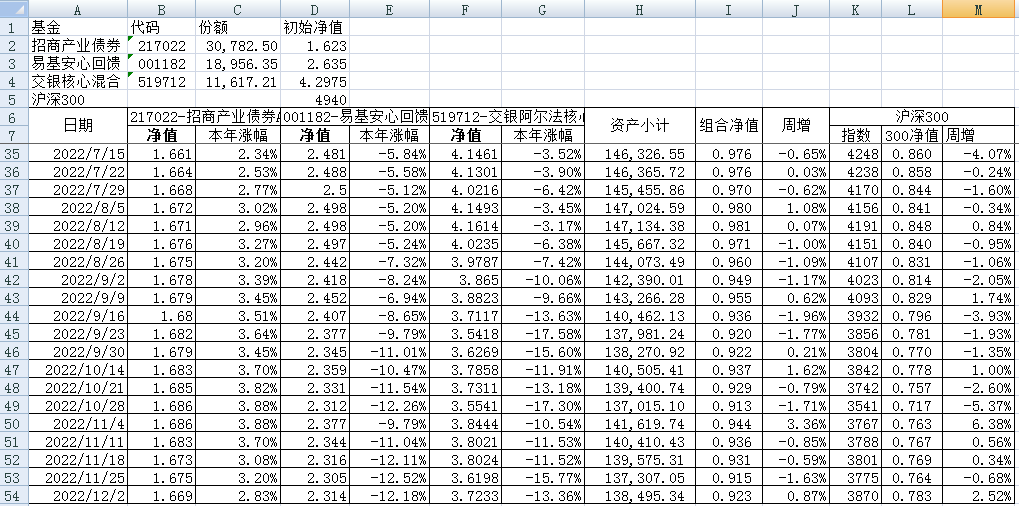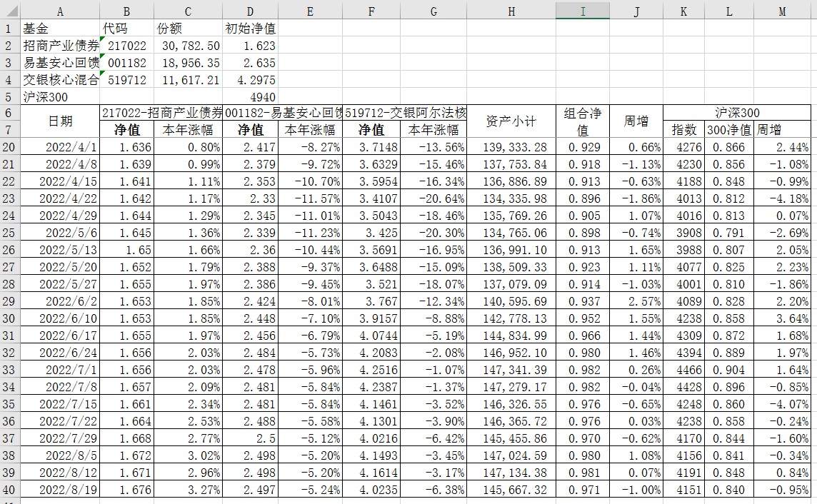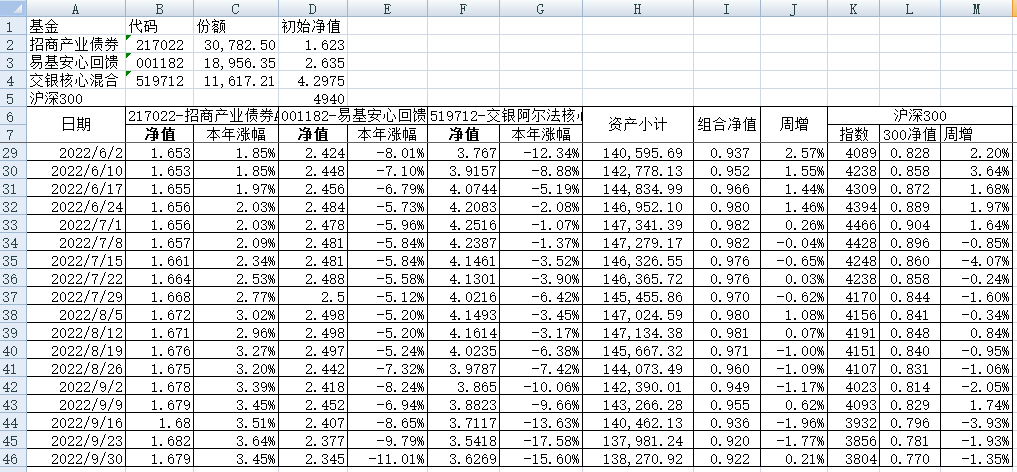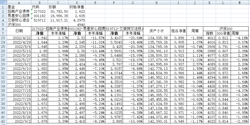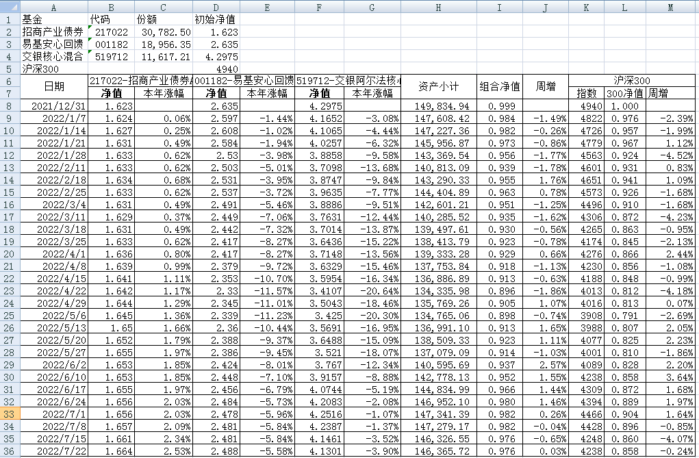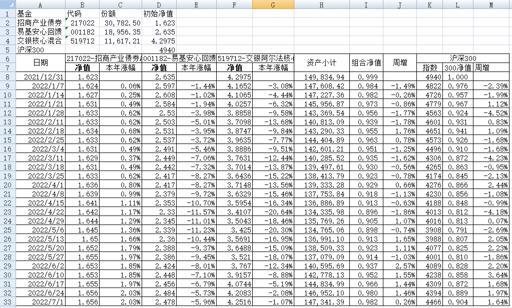 我的稳健组合-7%,赛道组合-13%。虽然跑赢两个指数,但收益是负的。仅有招商产业债券A一只基金保持正收益(2.59%),跌幅最大的是大摩健康产业混合基金(-22%)。