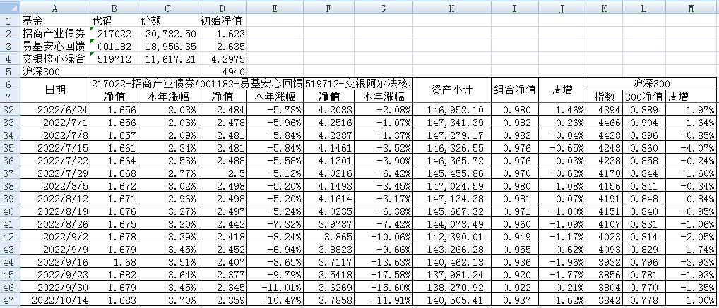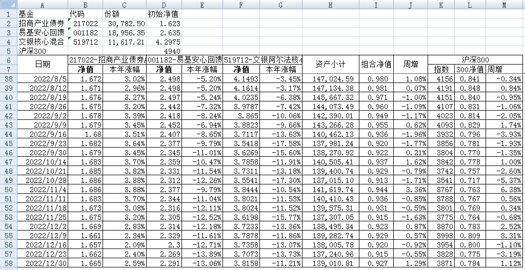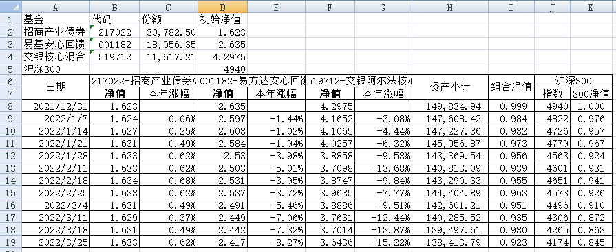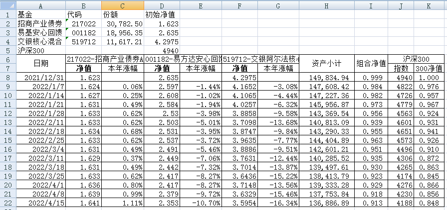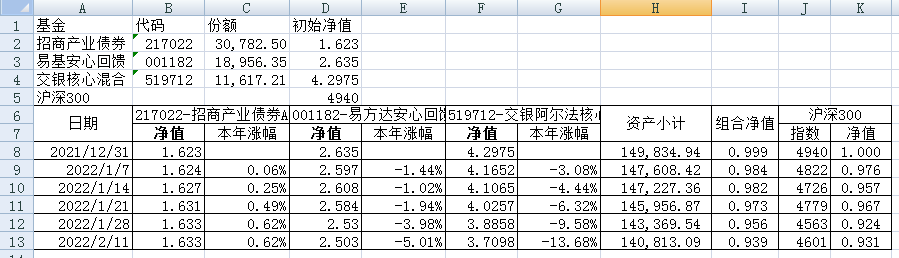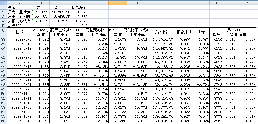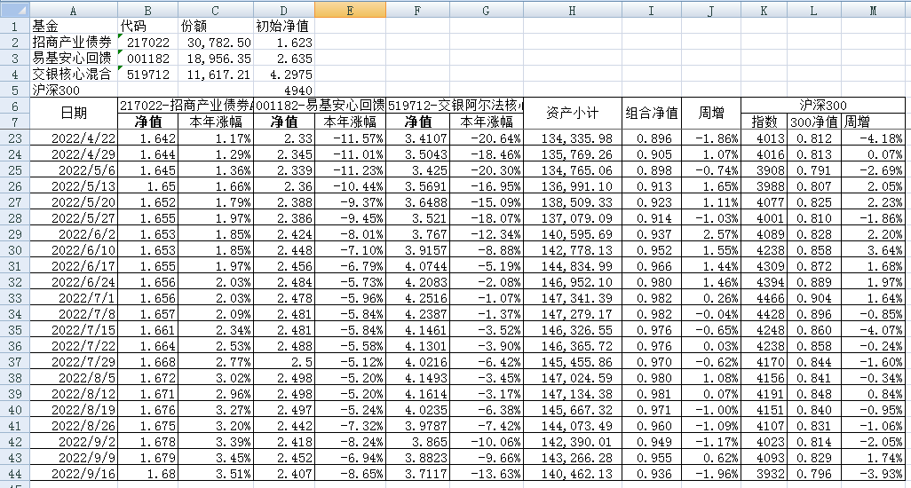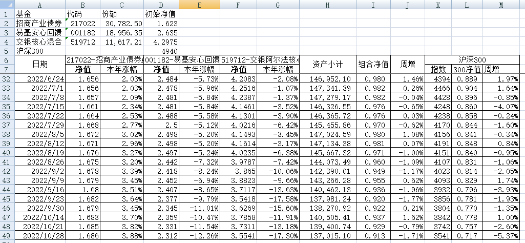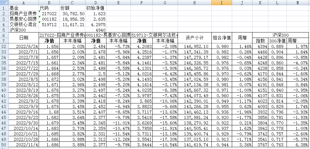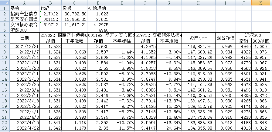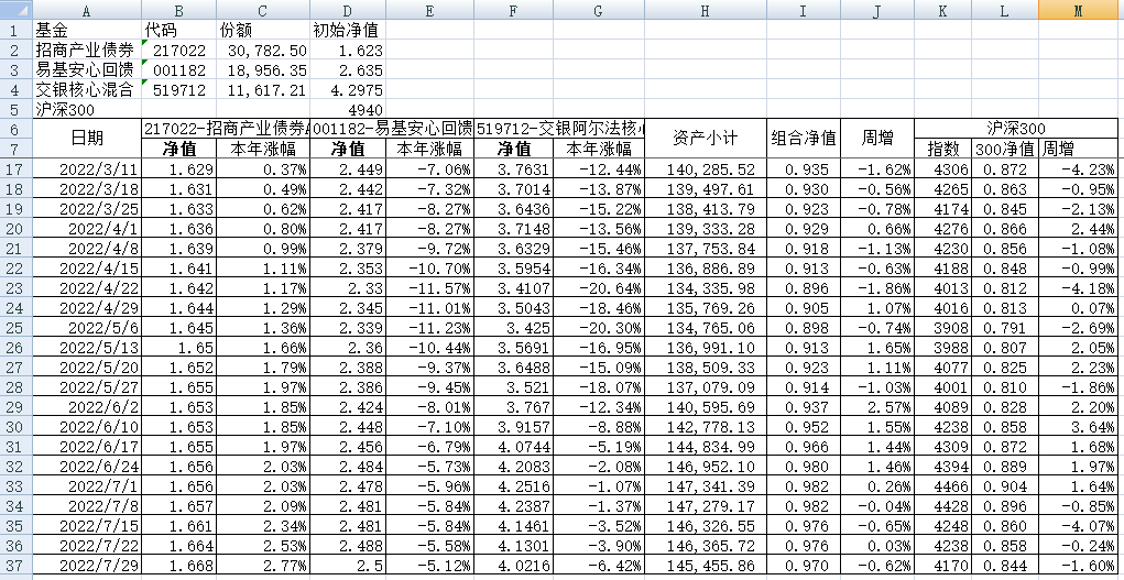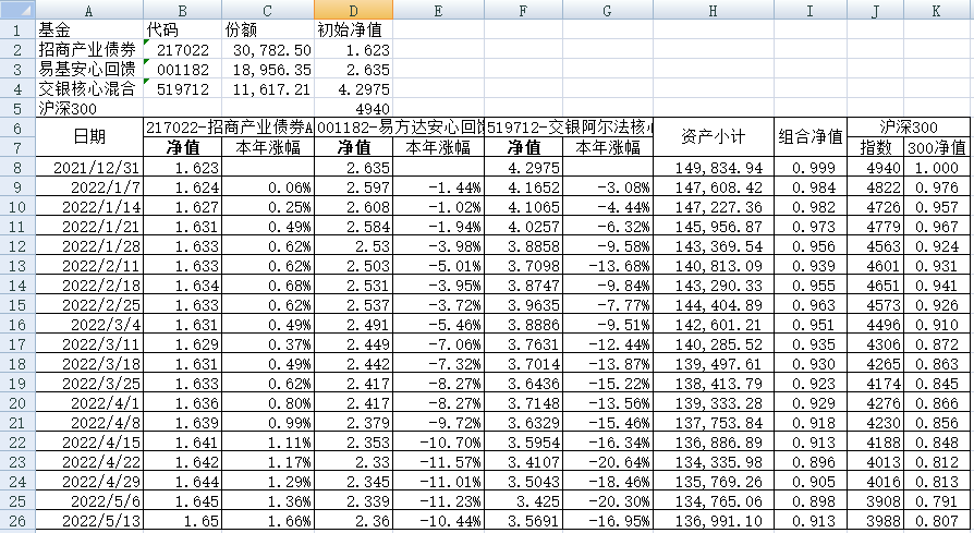 我的稳健组合-7%,赛道组合-13%。虽然跑赢两个指数,但收益是负的。仅有招商产业债券A一只基金保持正收益(2.59%),跌幅最大的是大摩健康产业混合基金(-22%)。