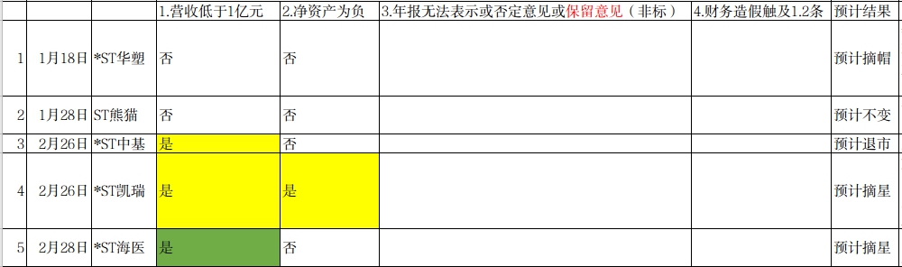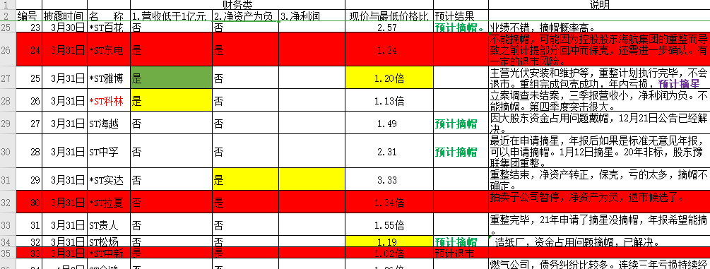 趁着孩子睡觉有空,把3月31日前披露年报的都都看了一遍。总共33只,除去*ST盈方暂停上市,剩余的32只,退市4只,确定摘帽9只。东电、拉夏、中新基本退市了;金泰营收低于1亿,净利润为主,扣非为负,个人认为也差不多退市了。巴士、凯瑞、维维、威尔、百花、海越、中孚、大有、松炀这9只从预报来看确定性高。明天过年了,提前祝各位集友,新年快乐,虎年大挣。