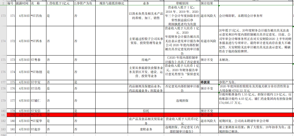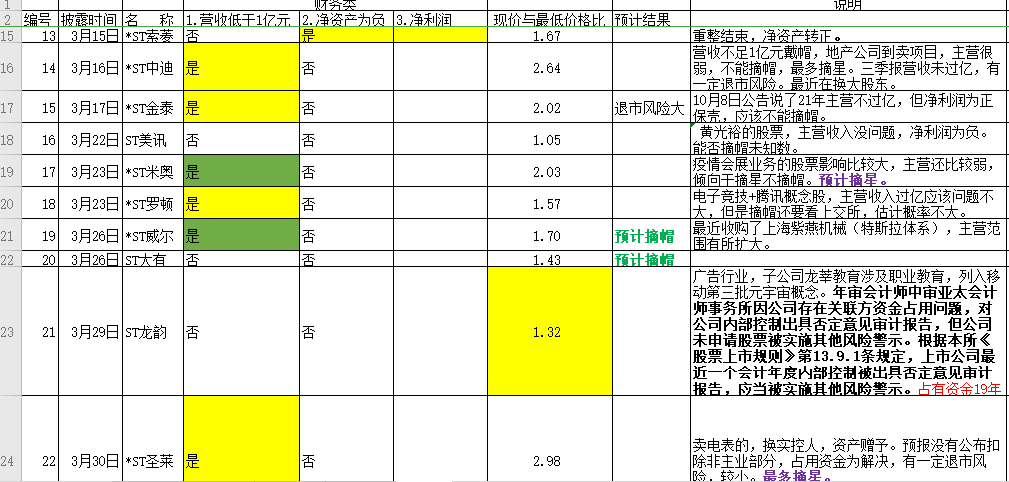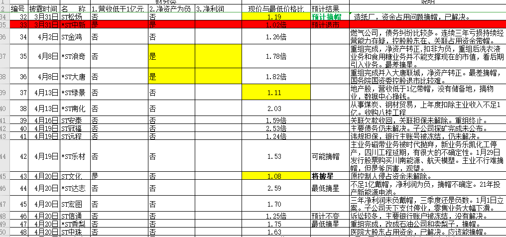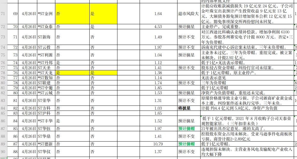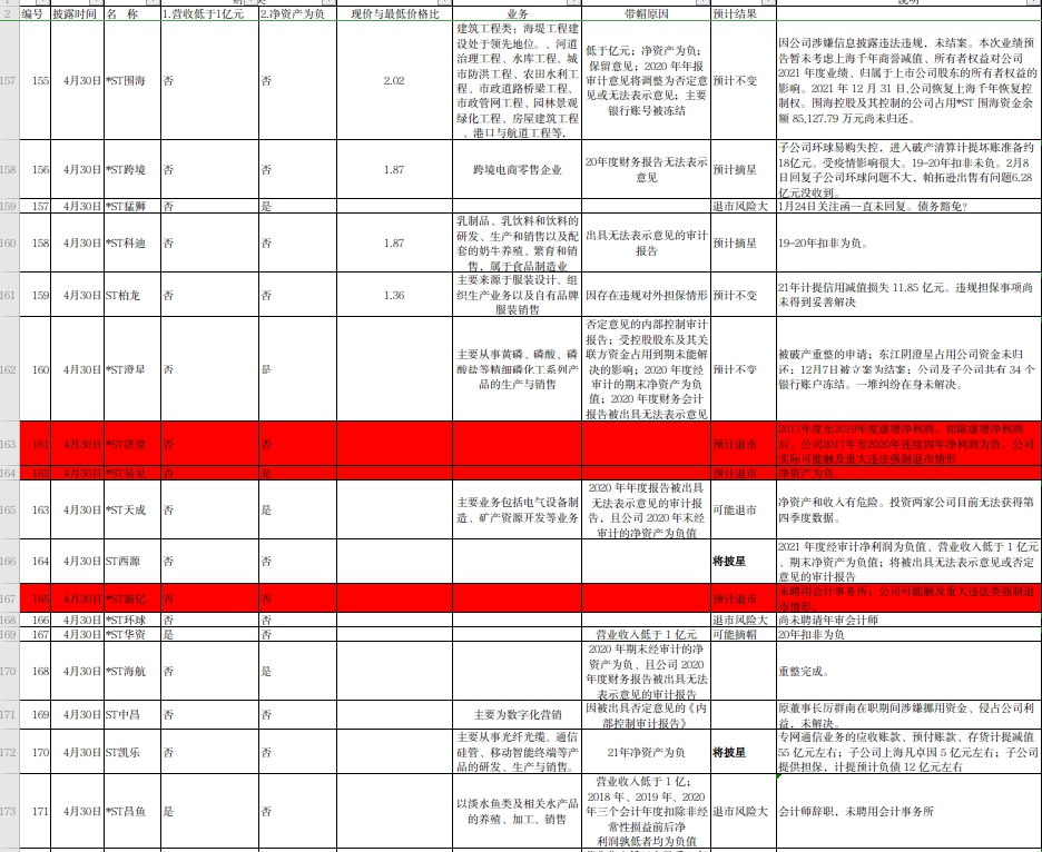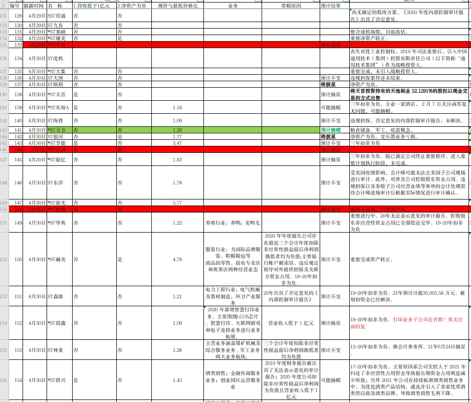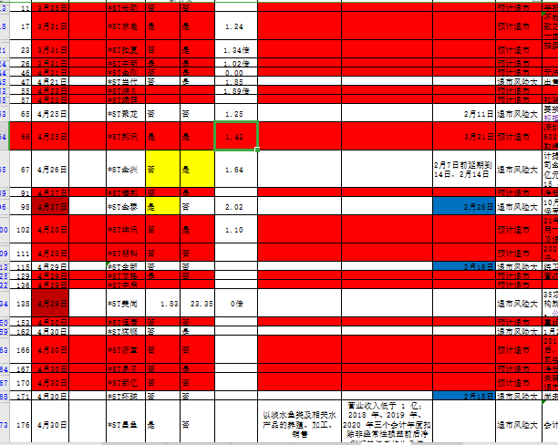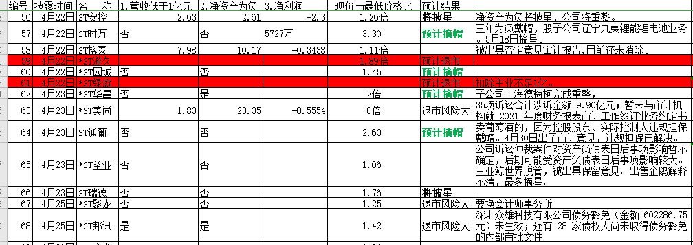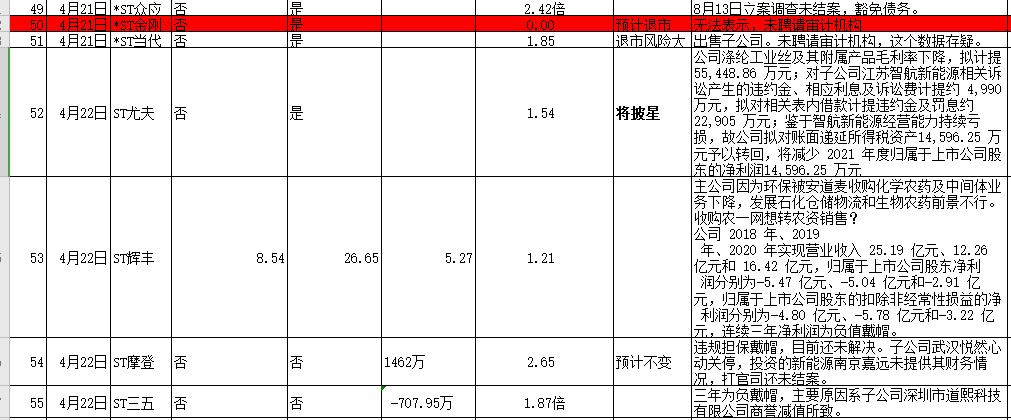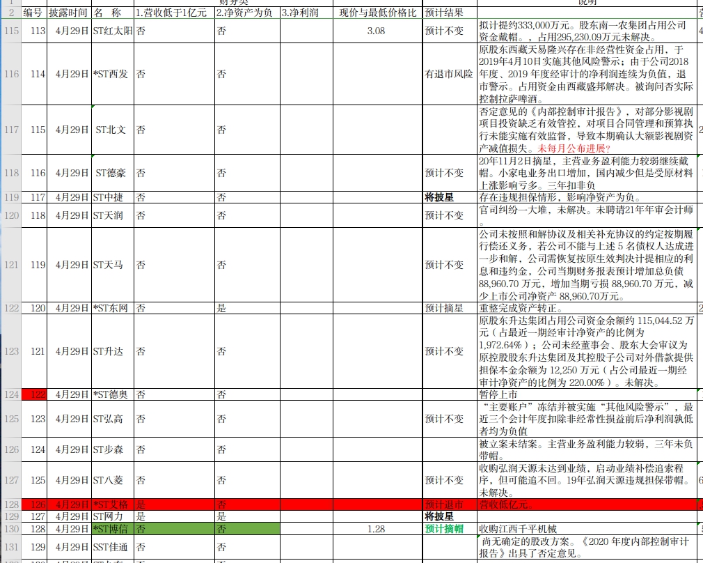 把st年报披露的过了一遍,4月下旬真是天雷滚滚,差不多40多家退市,充分实践了应退尽退。