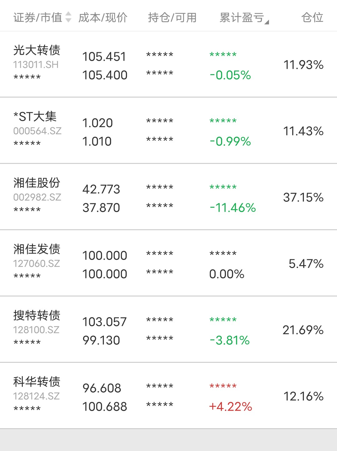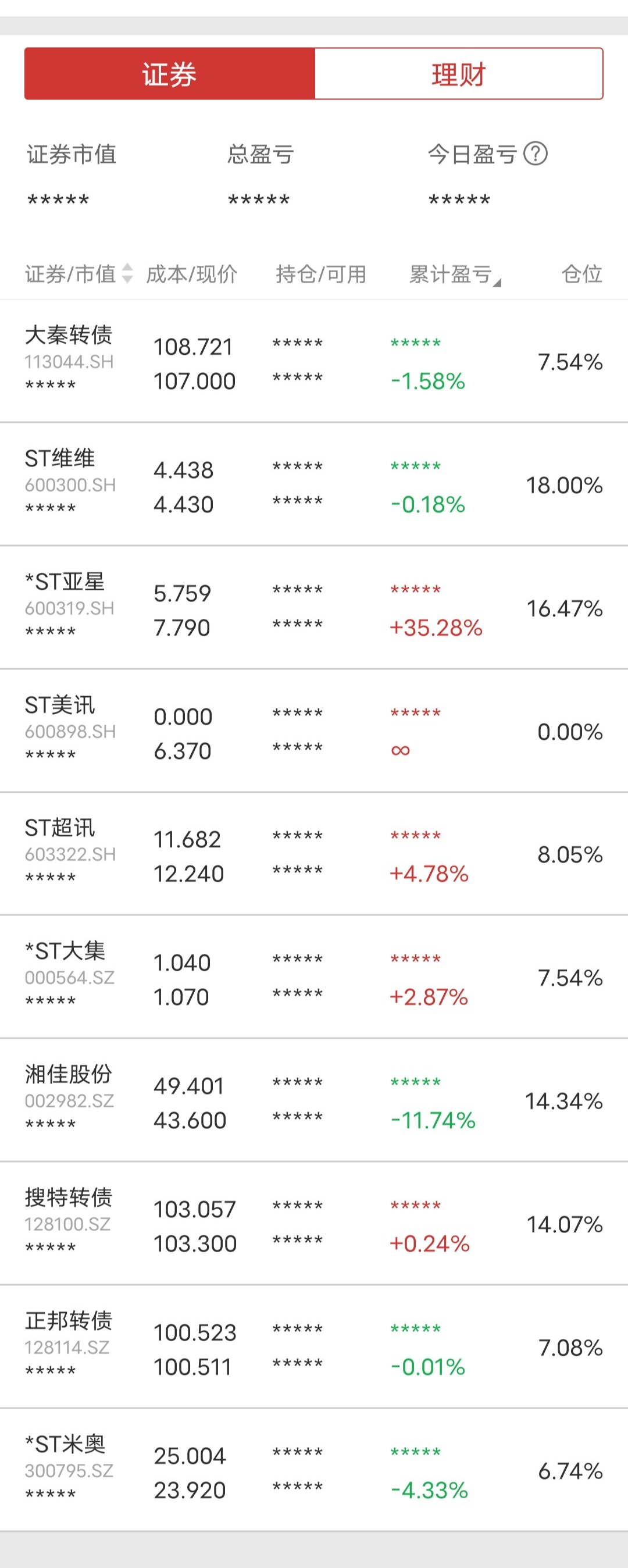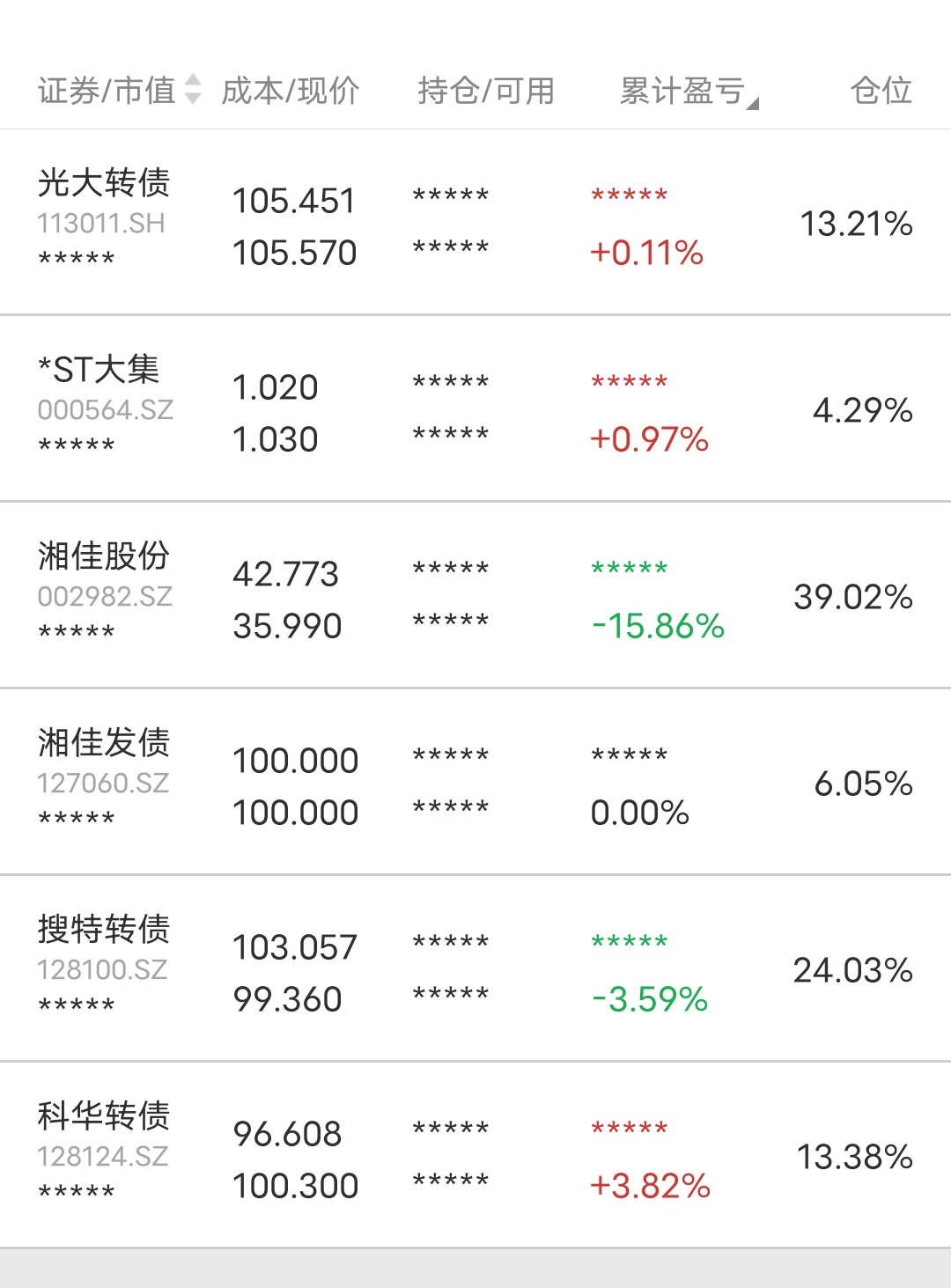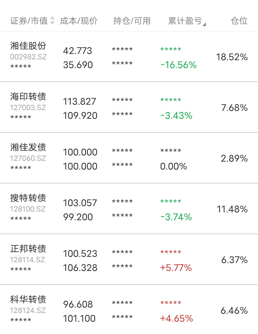 曾经是新韭菜时,听老韭菜说银行上涨行情就差不多到头了,现在自已也是老韭菜了希望这次不一样。目前,持有凯瑞、威尔、万方、华塑(看着涨着好没忍住)、松炀;光大转债,湘佳股份(抄的作业)。