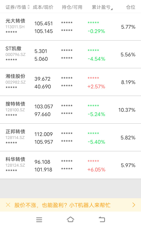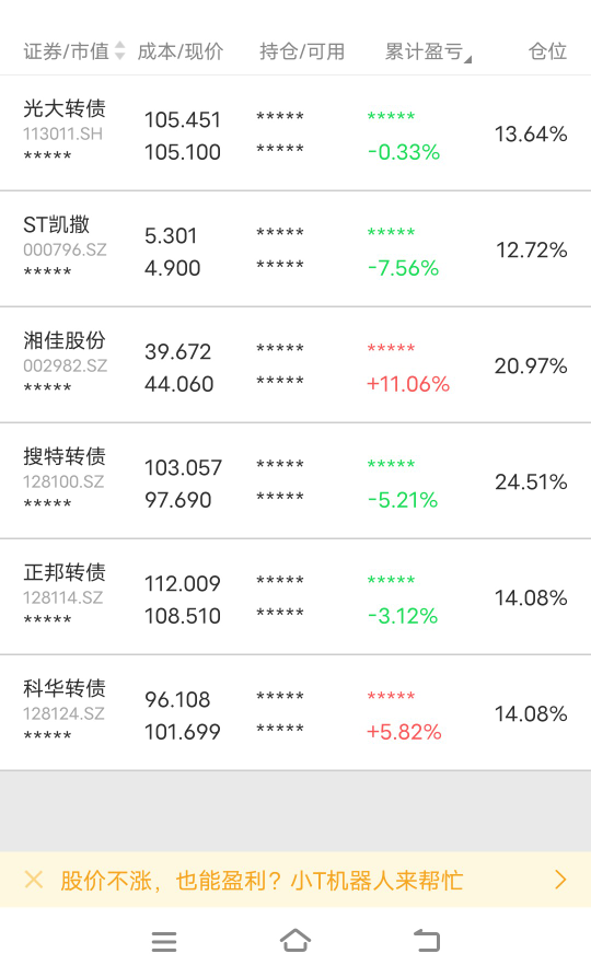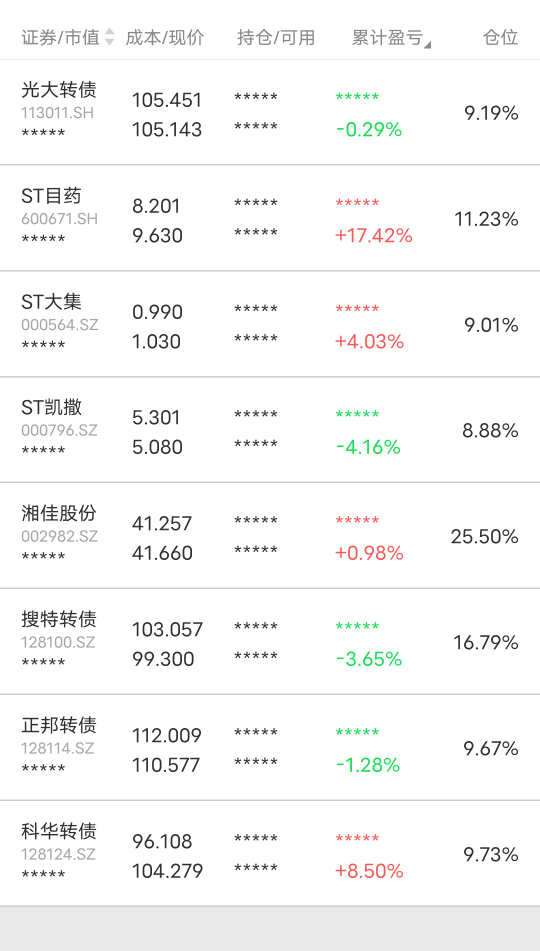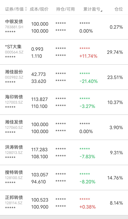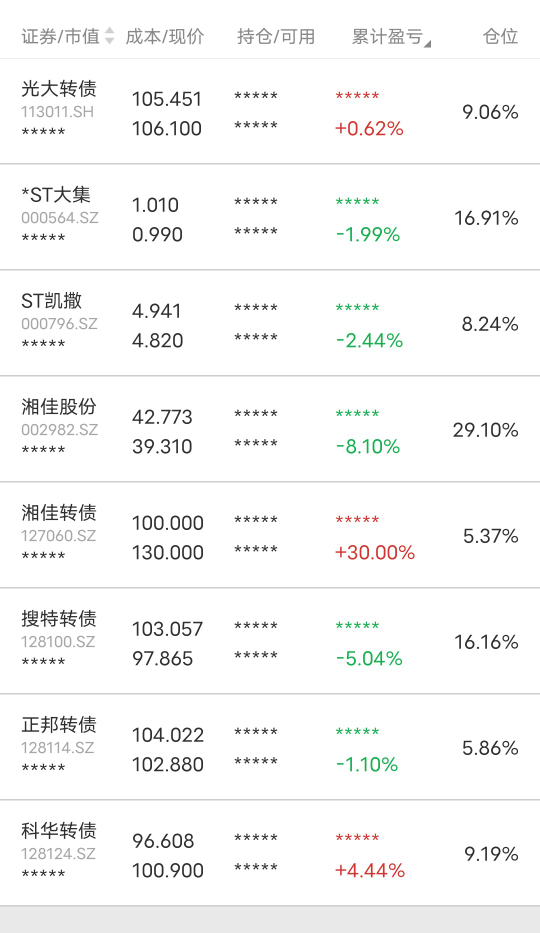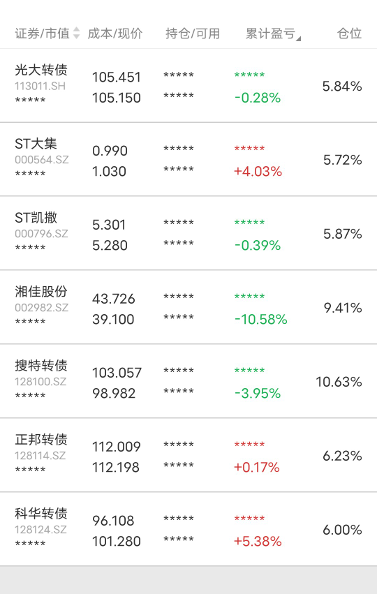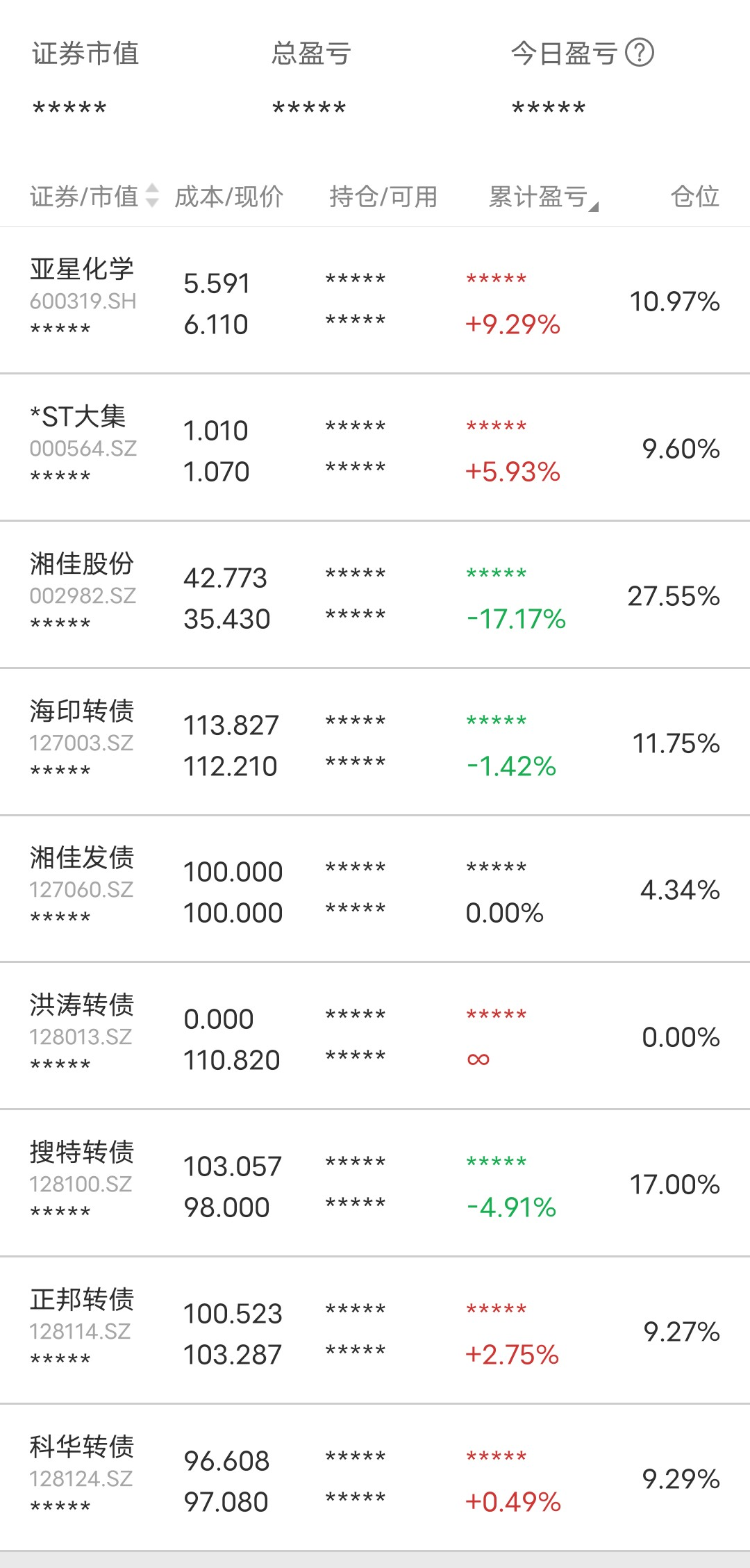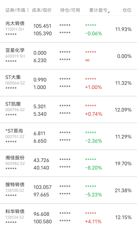 曾经是新韭菜时,听老韭菜说银行上涨行情就差不多到头了,现在自已也是老韭菜了希望这次不一样。目前,持有凯瑞、威尔、万方、华塑(看着涨着好没忍住)、松炀;光大转债,湘佳股份(抄的作业)。