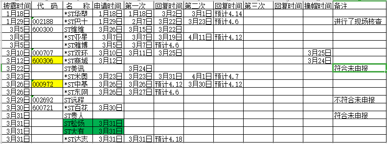 4月的标太多了又忙着拜年,到现在只看到4月25日,总计35只,退市3只,确定摘帽4只。金刚、游久、绿庭基本退市了;时万、圆城、华昌、通葡确定性高。另外当代、聚龙、邦讯退市风险也很大。