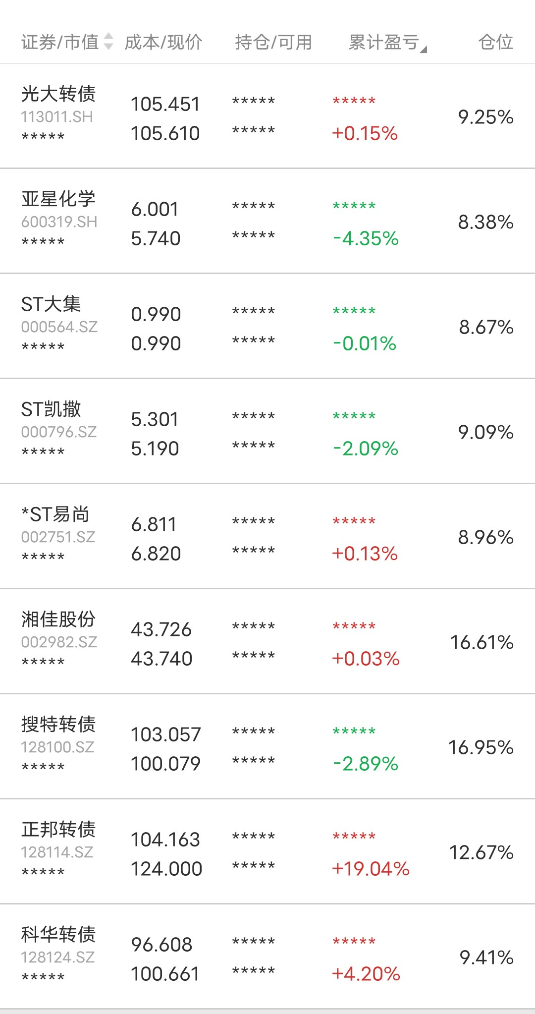 3月前披露年报的*ST华塑、ST熊猫、*ST中基、*ST凯瑞、*ST海医,数据来至三季报,其中中基退市风险大,华塑摘帽希望大。可转债全面走高目前只持仓海印。