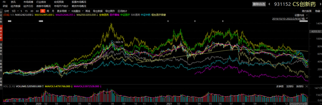 一个可能的原因,就是很多医疗公司都是在港股上市的,尤其是细分领域的比如CRO等,A股也有,但港股美股也分散了很多。但我们还有:HSSSHID 恒生沪深港创新药精选50指数,也有沪港深500等。所以这只能占一部分原因。