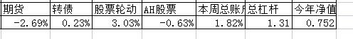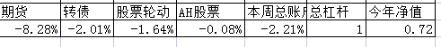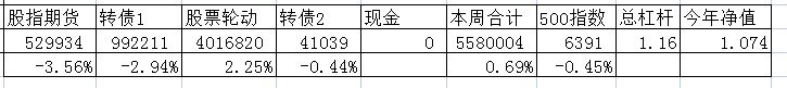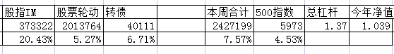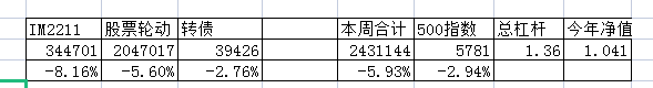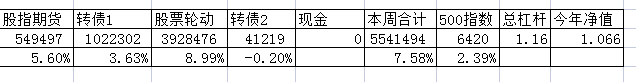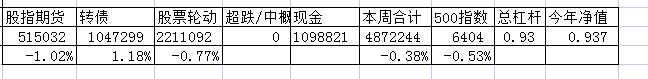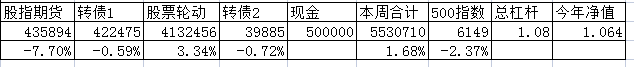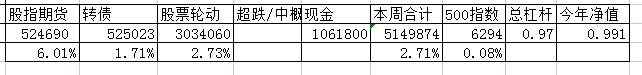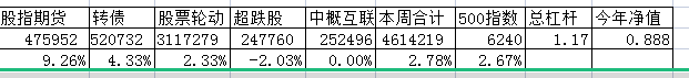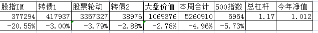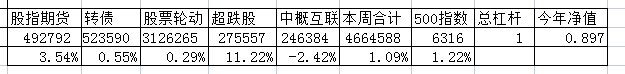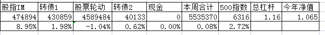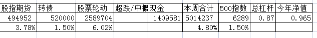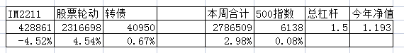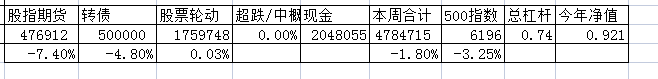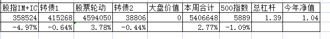 周五又减了1手IC,目前持有4手,杠杆1.92。贴水太少,只能降低IC持仓来应对波动,这部分资金希望在其他策略中能博得超额收益。下周计划加仓股票轮动50
