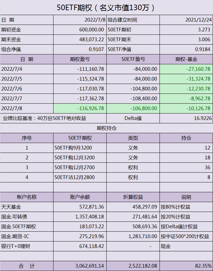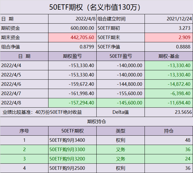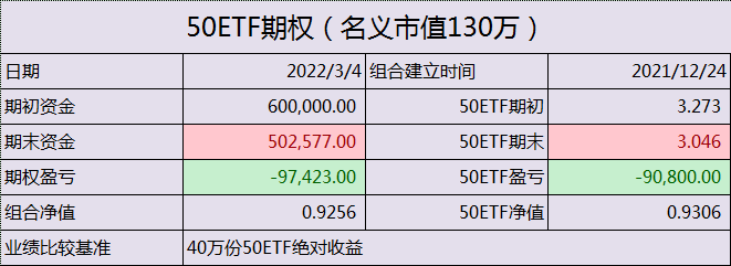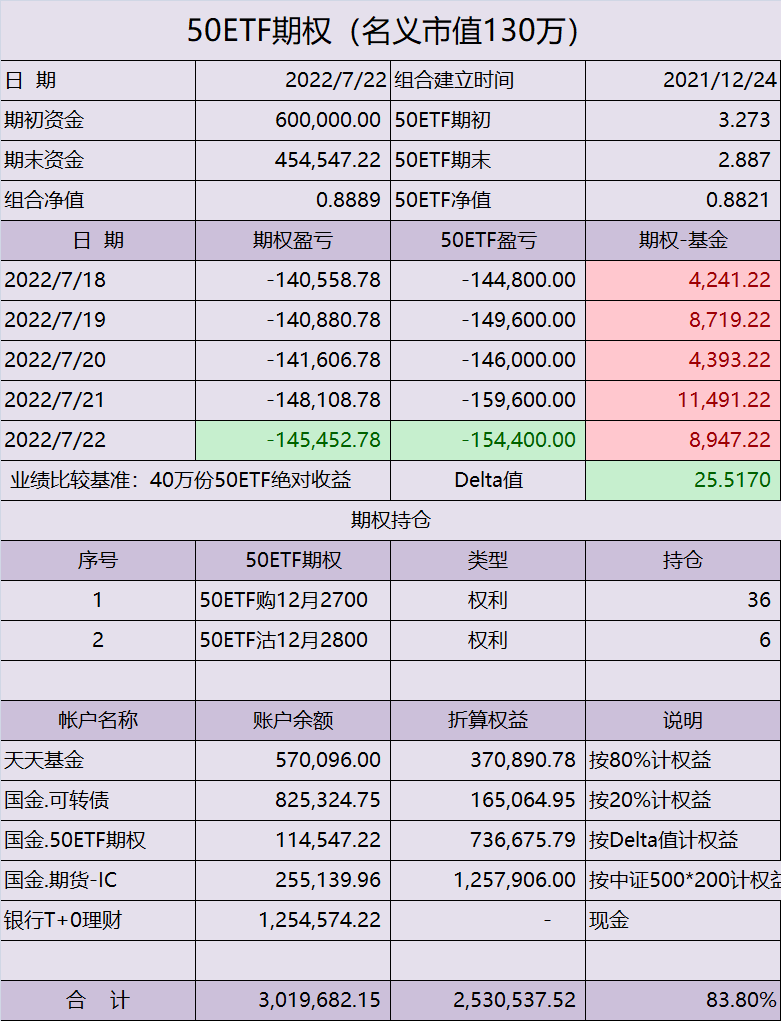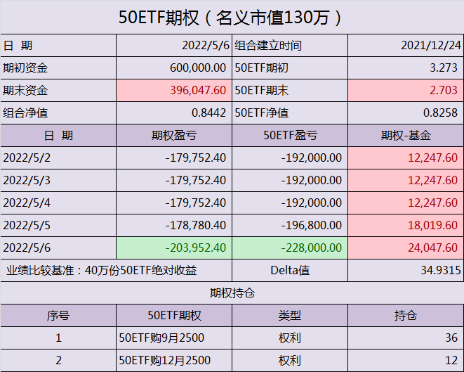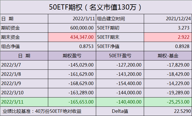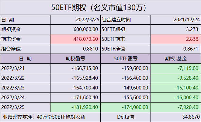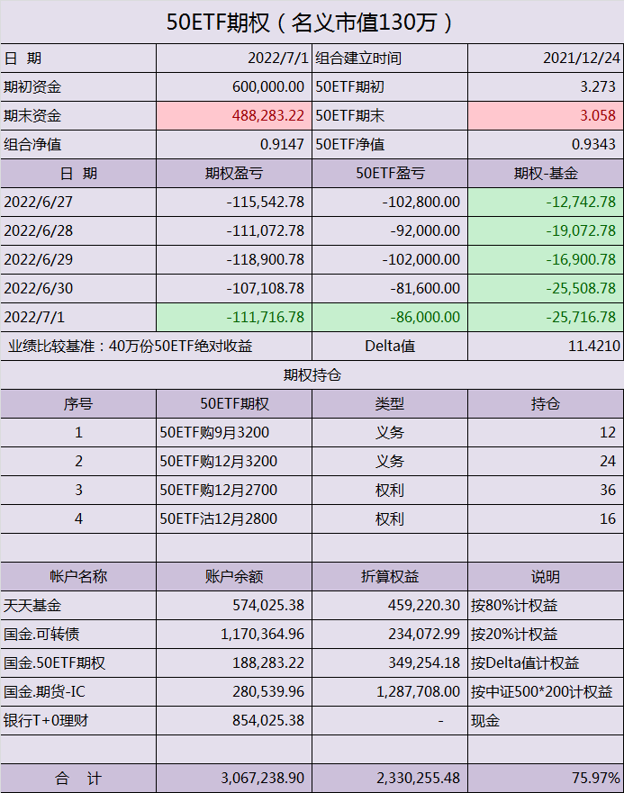 用60万资金做50ETF期权,以2021.12.24日收盘价计算,约等于130万市值。节约出来的资金用来配置基金,单独计算收益。
