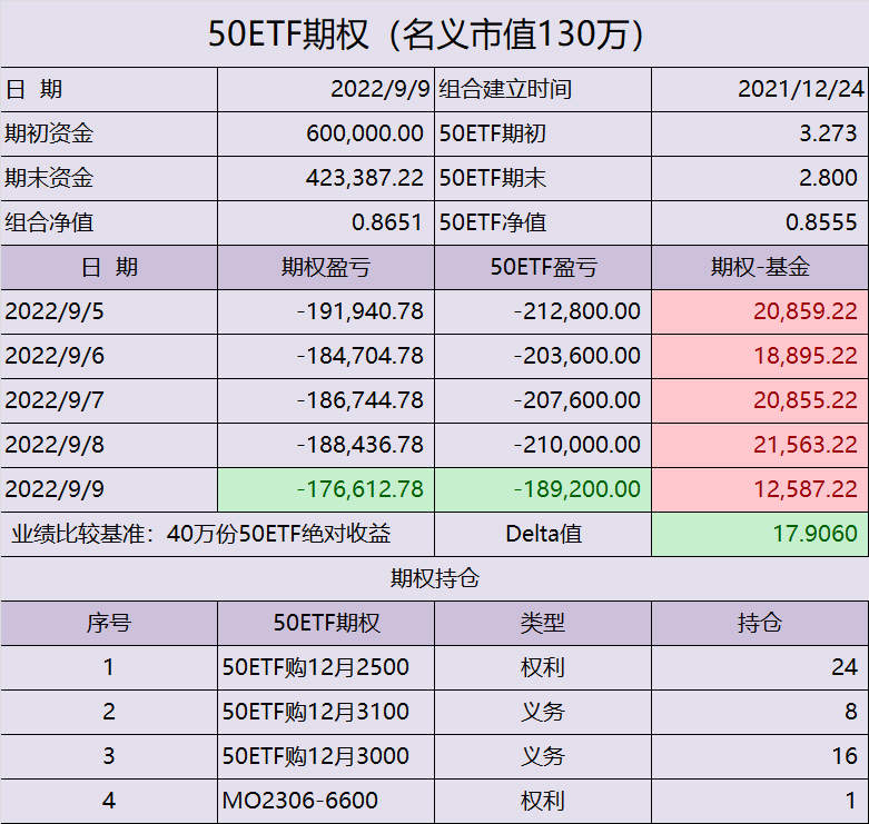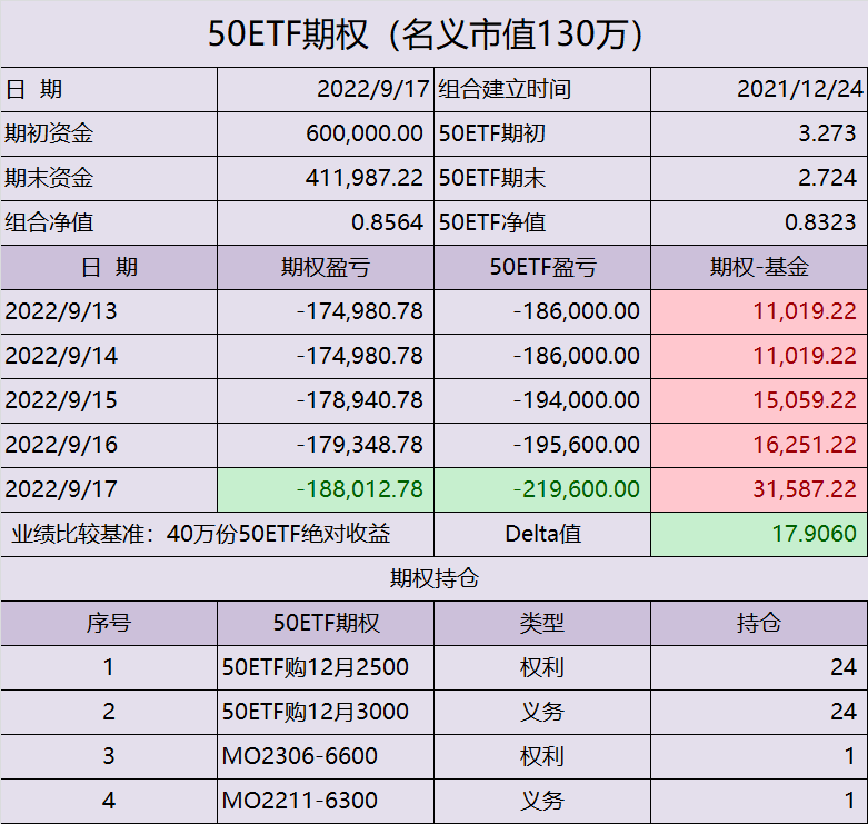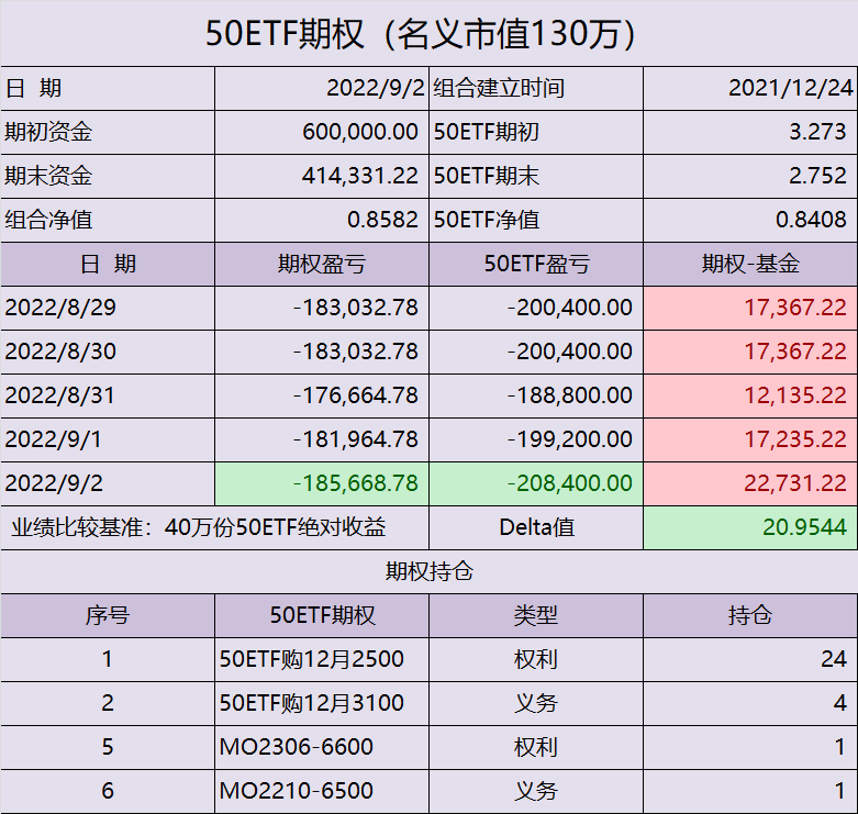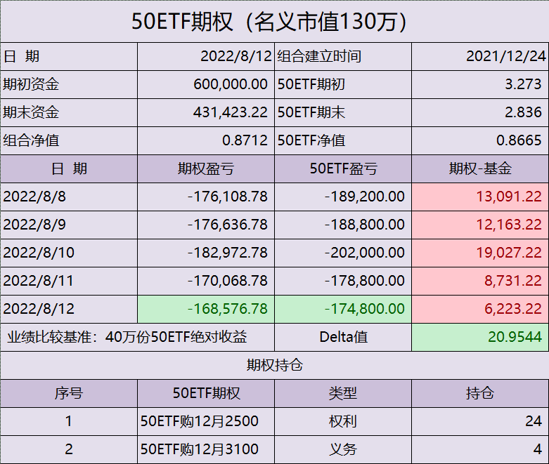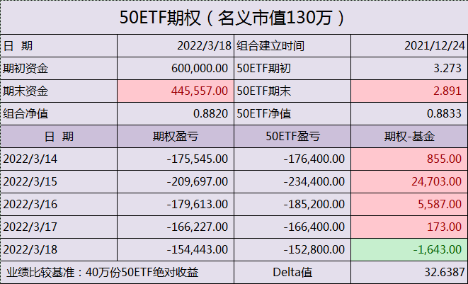 本周50ETF跌了2.8%,期权组合下跌2.22%,勉强跑赢,就看上涨时能不能跟上。