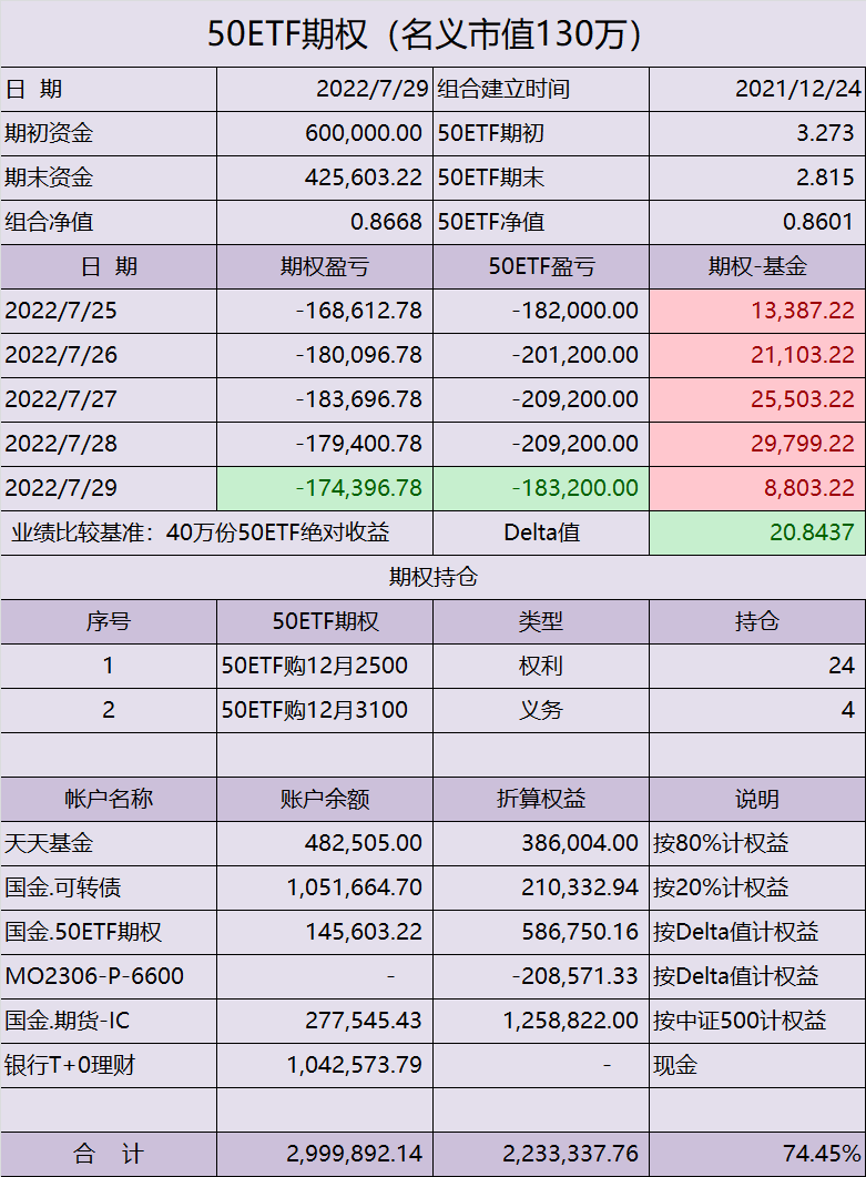 仓位还是有点重,大幅调整ETF期权的Delta值至22.92,证券投资整体仓位114.63%,在心理可承受范围。