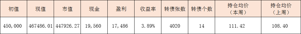 本周T胜达转债30张,140出,134回,迪贝转债138出90张,131.5回30张,补仓塞力30张113.6。截止今日,账户情况如下: