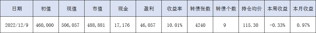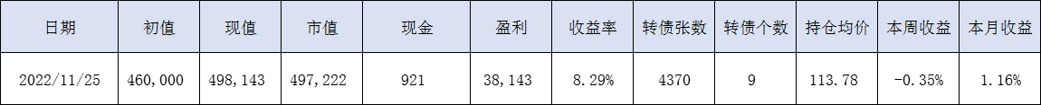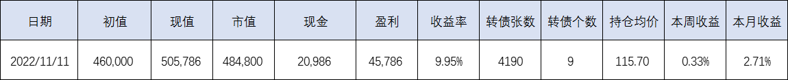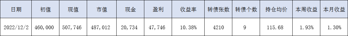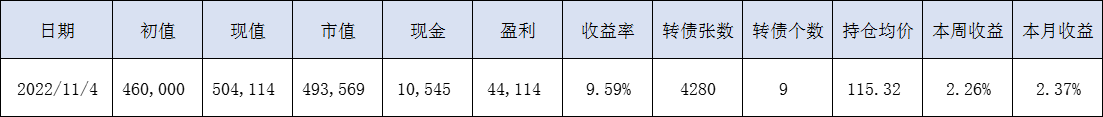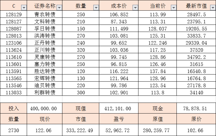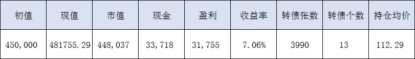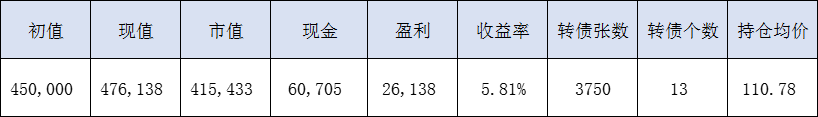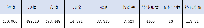 截止今日收益情况:已经清仓了文科转债,目前手里只剩下10支债,不过感觉惰性债比较多,慢慢调仓。