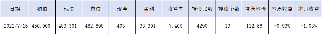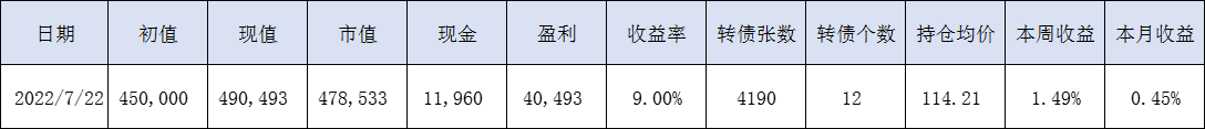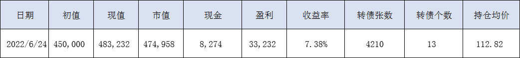 2022/6/30 本月结束,月收益仅有2.33%,严重跑输集思录转债等权指数6.68%的月涨幅,也比不上上证6.66%的月涨幅。