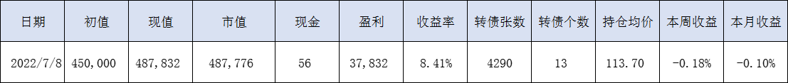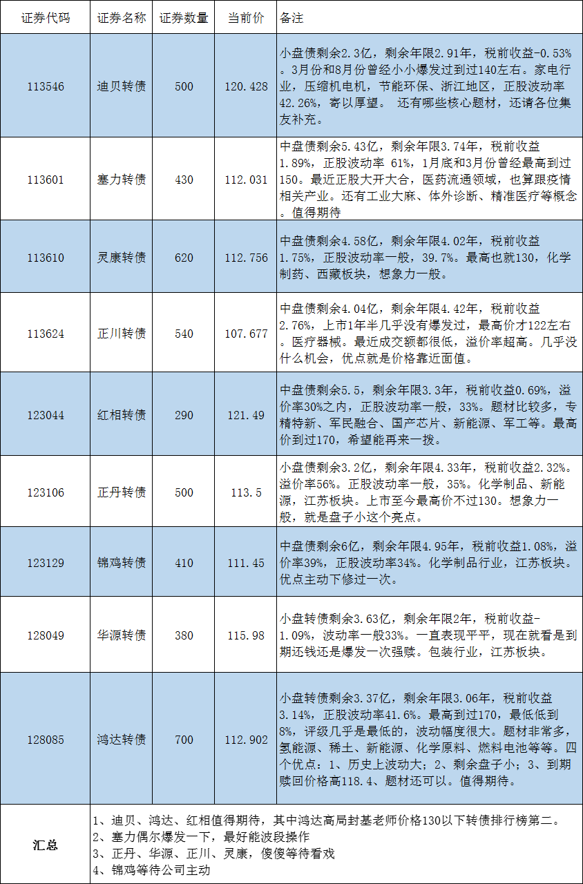 本周回补迪贝转债100张,塞力转债40张,鸿达转债40张。