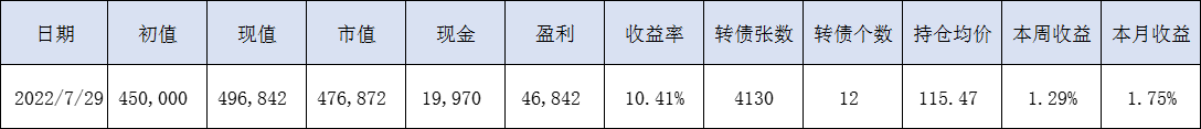 2022/7/29 一月又一月,本月侥幸不亏,截止目前,录得10.41%的收益。
