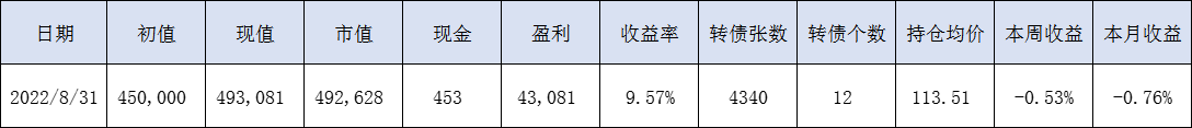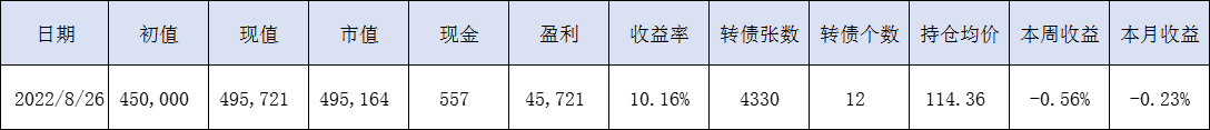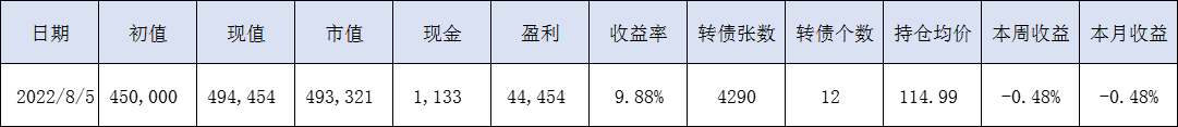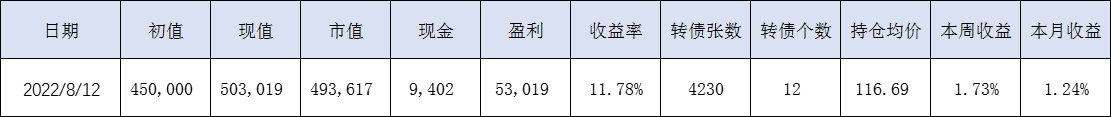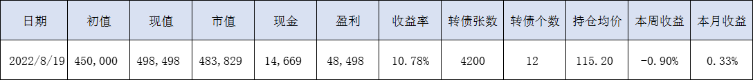 2022/8/19 山雨欲来风满楼,近两周账户的波澜不惊,终于在本周最后两天发生了变化,尤其是今天很多转债跌幅快速变大,集思录可转债等权指数今天跌了1.44%,昨天跌了0.76%。个人账户的变动也超过这个幅度了。