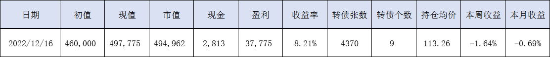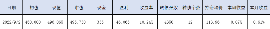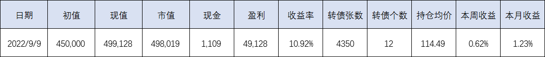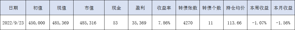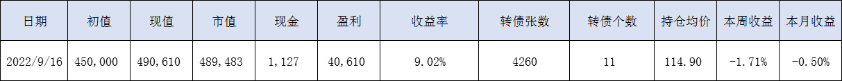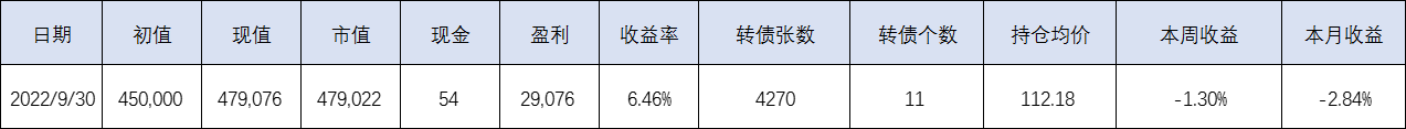 2022/9/9 本周几乎没有变化,130均价走了40张鸿达转,补充了40张正川转。结果这两天鸿达转下来了也没得补回了。下周再看看吧,青农转债一直半死不活,感觉快失去耐心了,持仓应该快一年多了,还是亏损中。