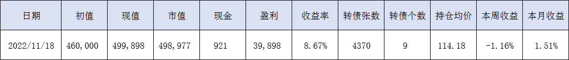 2022/11/18 还剩不到一个半月 2022年就结束了,很多人都说 年尾了,很难有像样的行情,因为一般都想要落袋为安。还有,本周集思录关于 可转债黄金时代可能已经结束的讨论很是火热,外加本周固定收益类的债券大幅下跌,可转债也在诸多的怀疑中 溢价逐渐收敛。