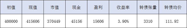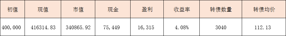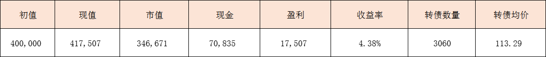 本周得益于迪贝转债的异军突起,最终录入正收益,截止今日收益 为 4.38%,持仓不变。