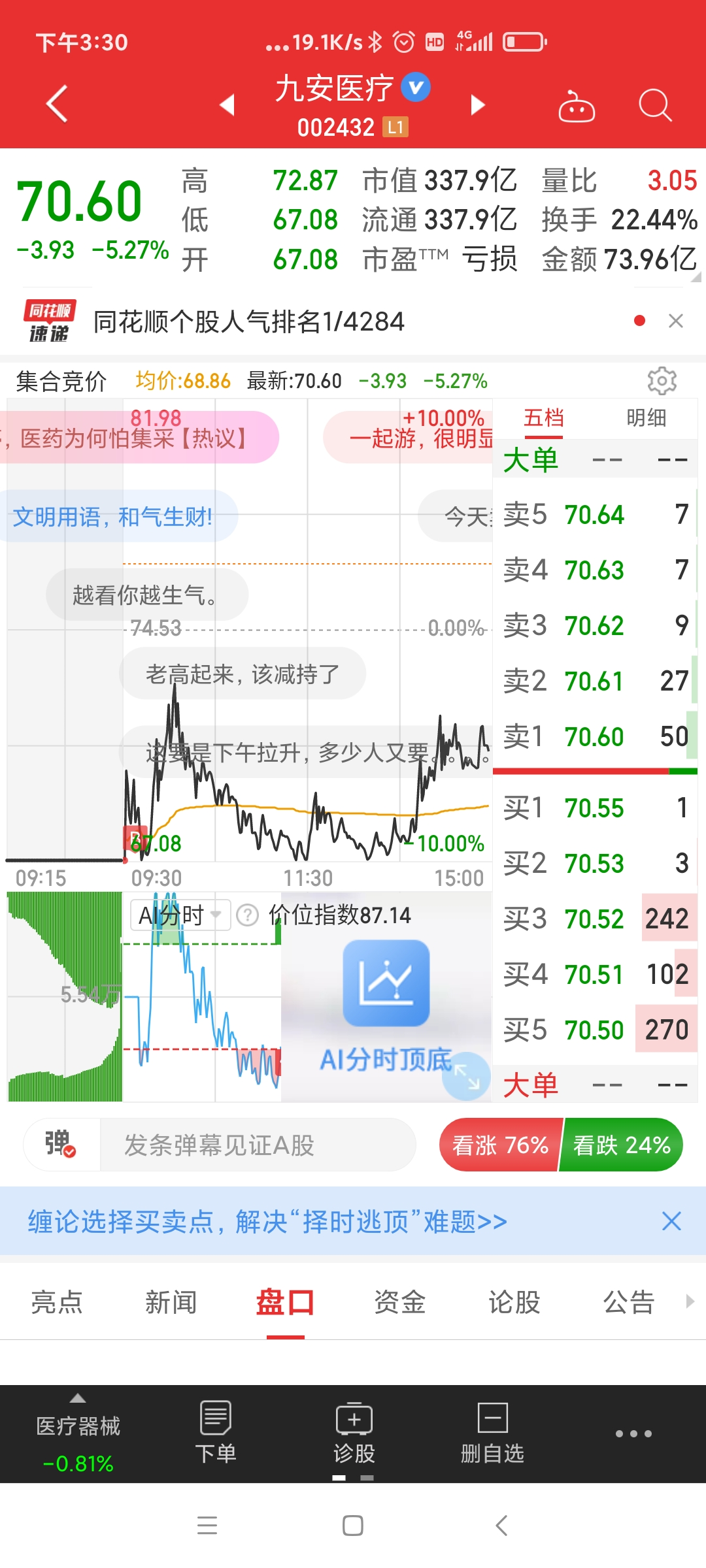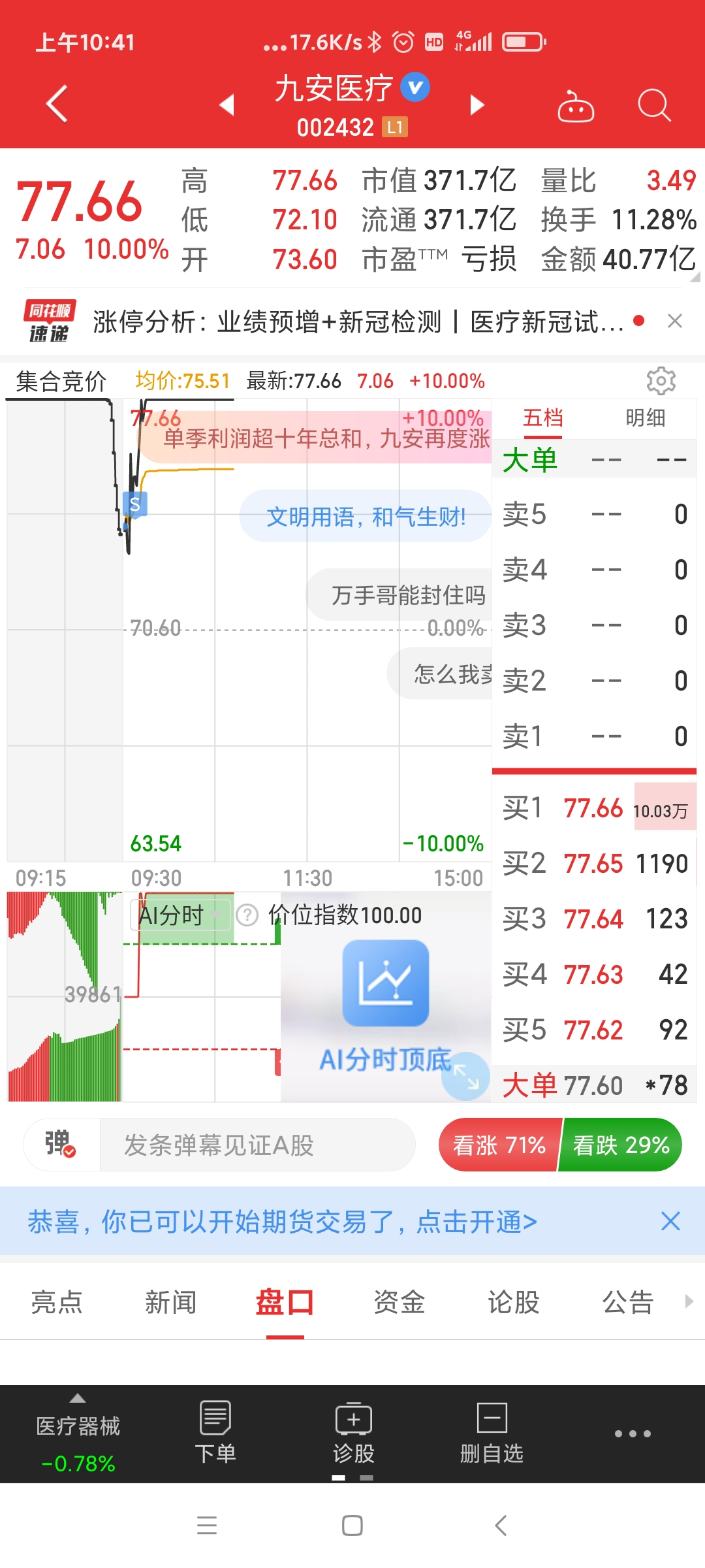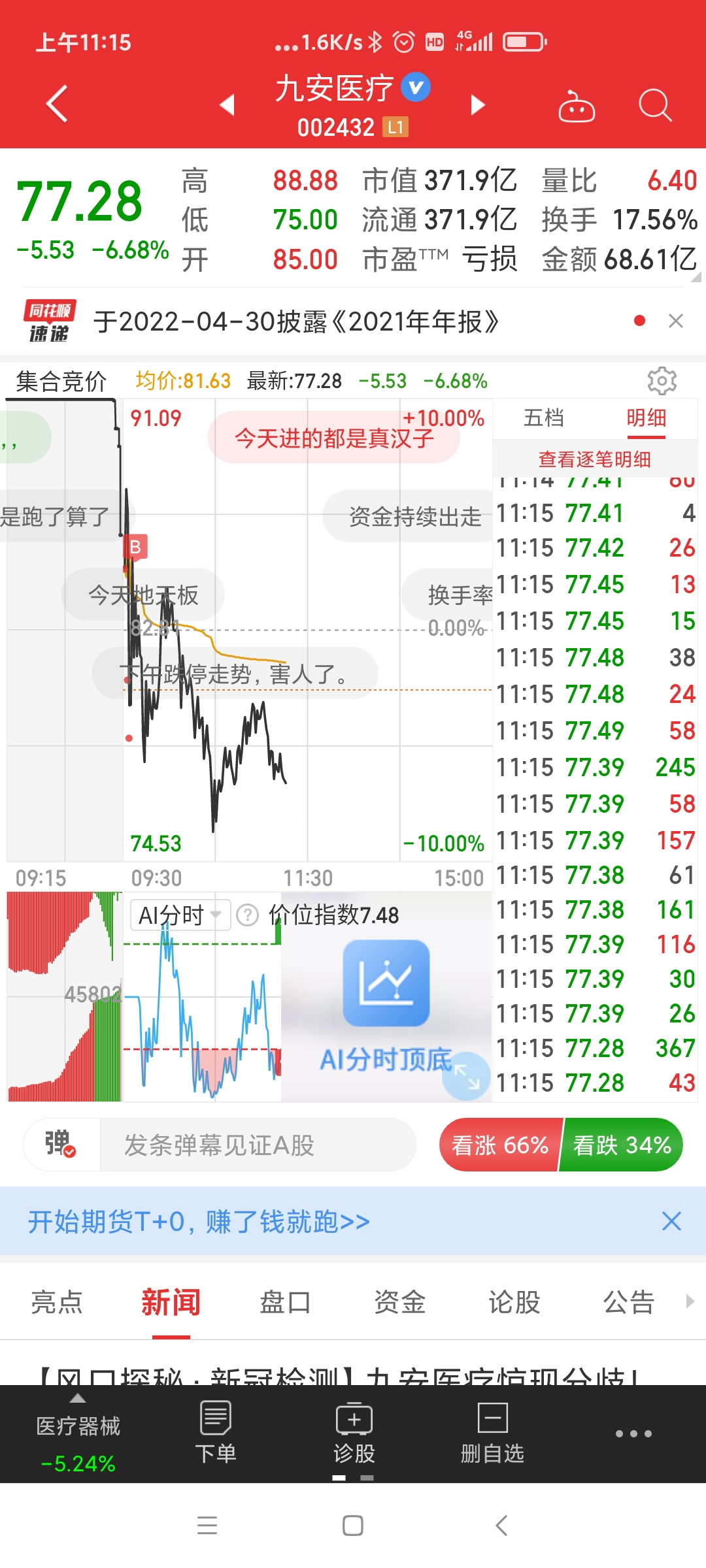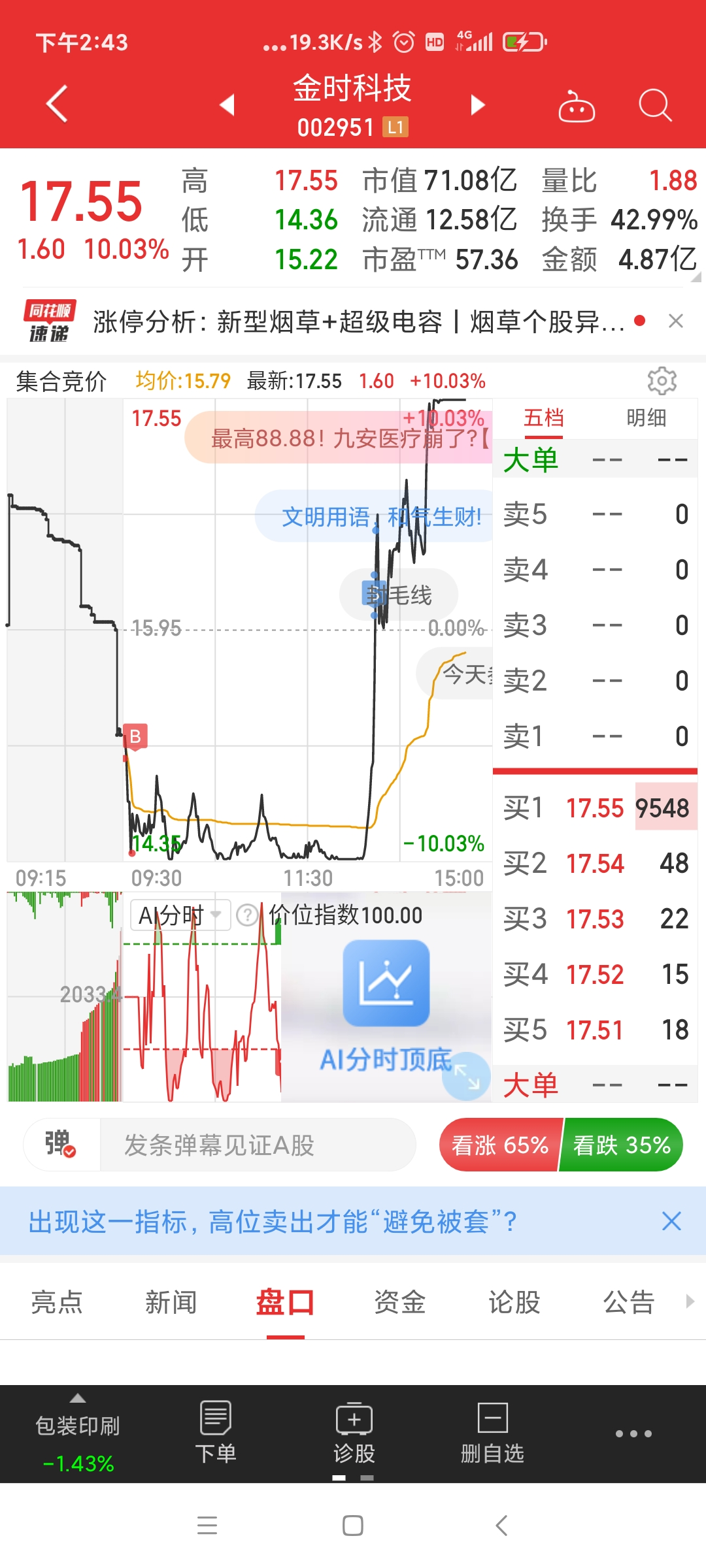 说一下卖九安的逻辑,主要是昨天晚上出了利好,我对妖股出利好一般的处理,如果高开太多的话,肯定会先把它出掉。早上刚开始九安是十个点的高开,然后慢慢的降到。八个,六个,这时心里更加坚定了卖出,因为主力会利用利好出货。没想到九安他不是妖股,他是妖王,